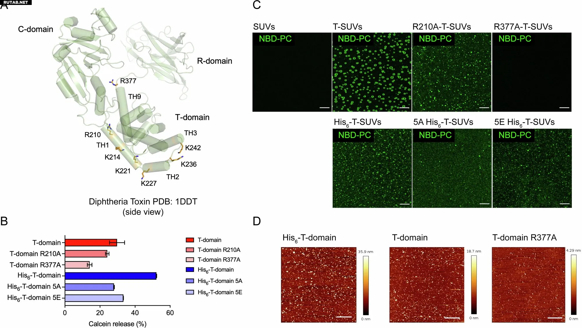 Определенные положительно заряженные аминокислоты в дифтерийном белке играют роль в слиянии при нейтральном pH. Аминокислоты связываются с отрицательно заряженной мембраной везикулы, что позволяет везикулам адсорбироваться на стеклянной поверхности.