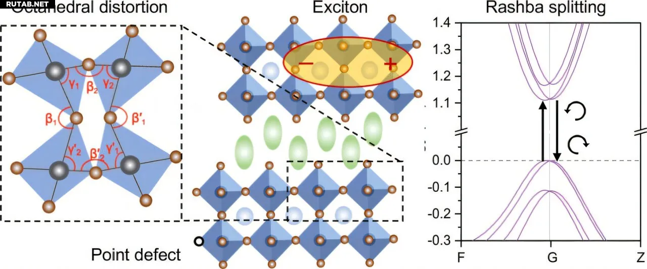 Одновременно это же искажение нарушает симметрию кристалла и вызывает квантовый эффект — расщепление Рашбы. Это позволяет материалу излучать циркулярно поляризованный свет, который востребован в спинтронике, защищённой оптической связи и квантовых технологиях.