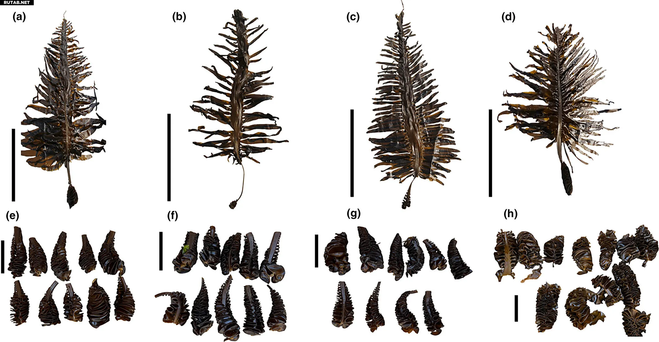 Триплоидные спорофиты Undaria pinnatifida (a,b,c) и их спорофиллы (e,f,g) и их диплоидные аналоги (d, h). Автор: IOCAS