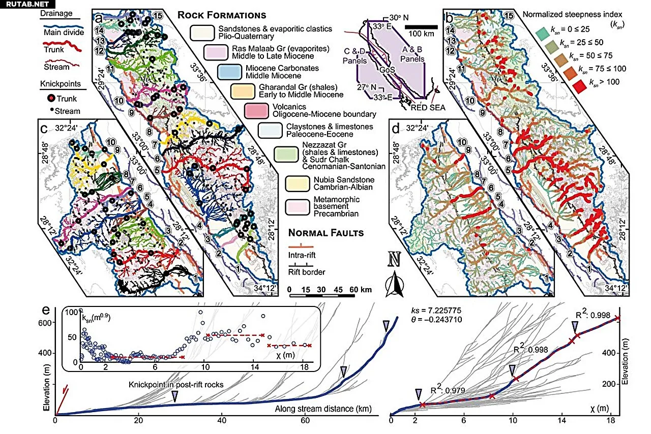 Водосборные бассейны рек, тектонические «ступеньки» и ksn в краях рифта, а также два профиля речных каналов в плио-четвертичных породах. Автор: Geophysical Research Letters (2025). DOI: 10.1029/2025gl117313
