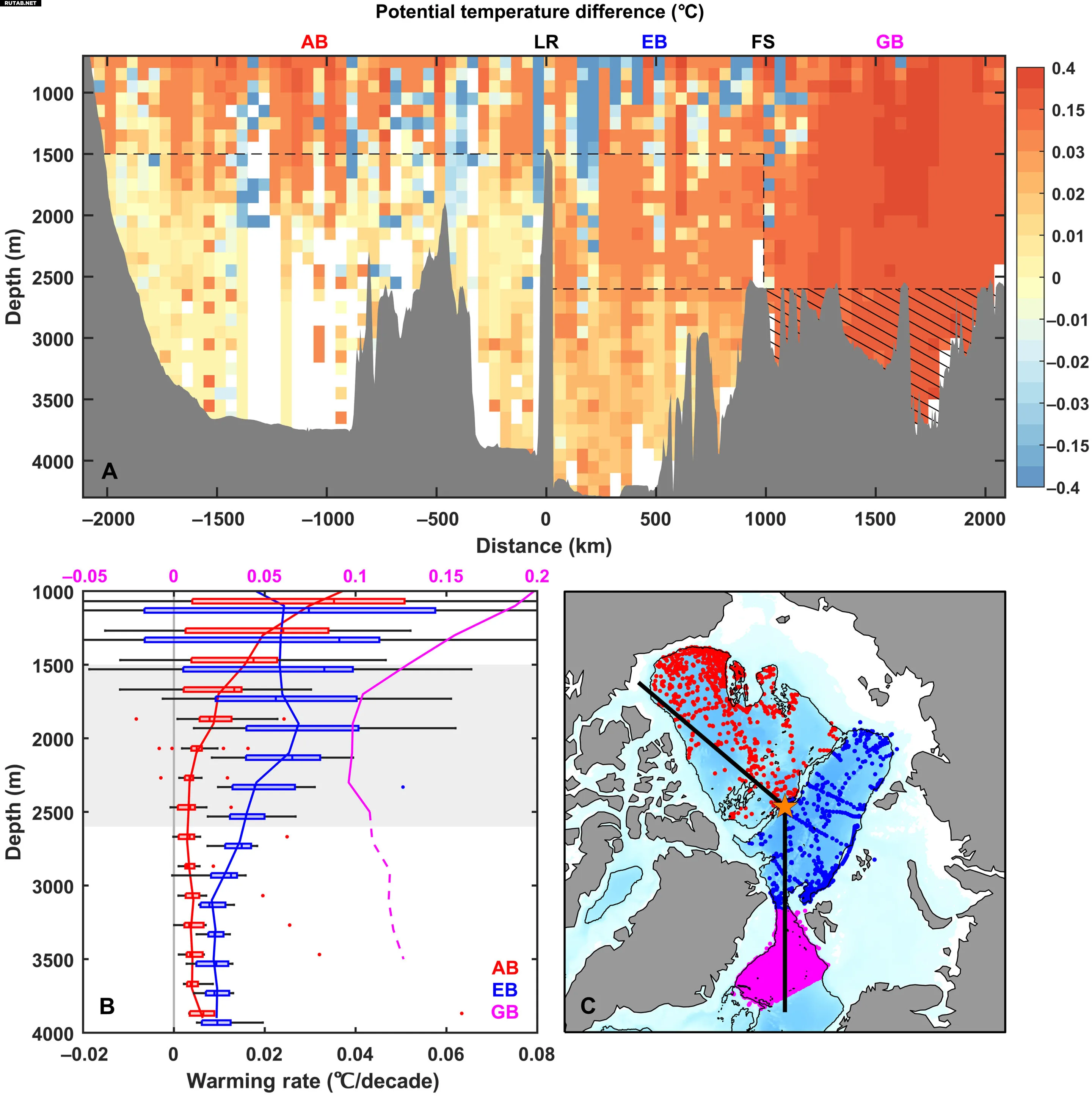 «Наши выводы указывают на то, что потепление глубоководной части Гренландского бассейна уже оказало очевидное воздействие на глубины Северного Ледовитого океана», — написали исследователи в своей работе. — «Горизонтальный перенос тепла от прогревающихся глубинных вод GB является доминирующим фактором, вызывающим быстрое потепление в глубоководной части EB».