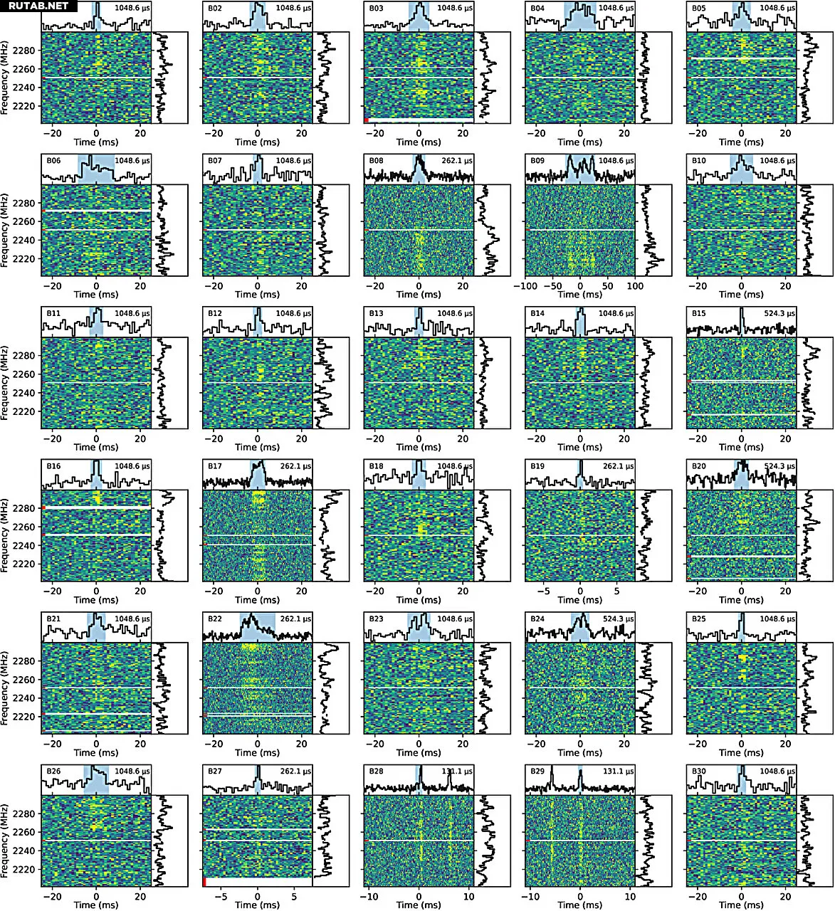 Типичные всплески FRB 20240114A, зарегистрированные телескопом TMRT. На каждом графике динамический спектр показан в центре, с профилем во временной области сверху и профилем в частотной области справа. Автор: SHAO