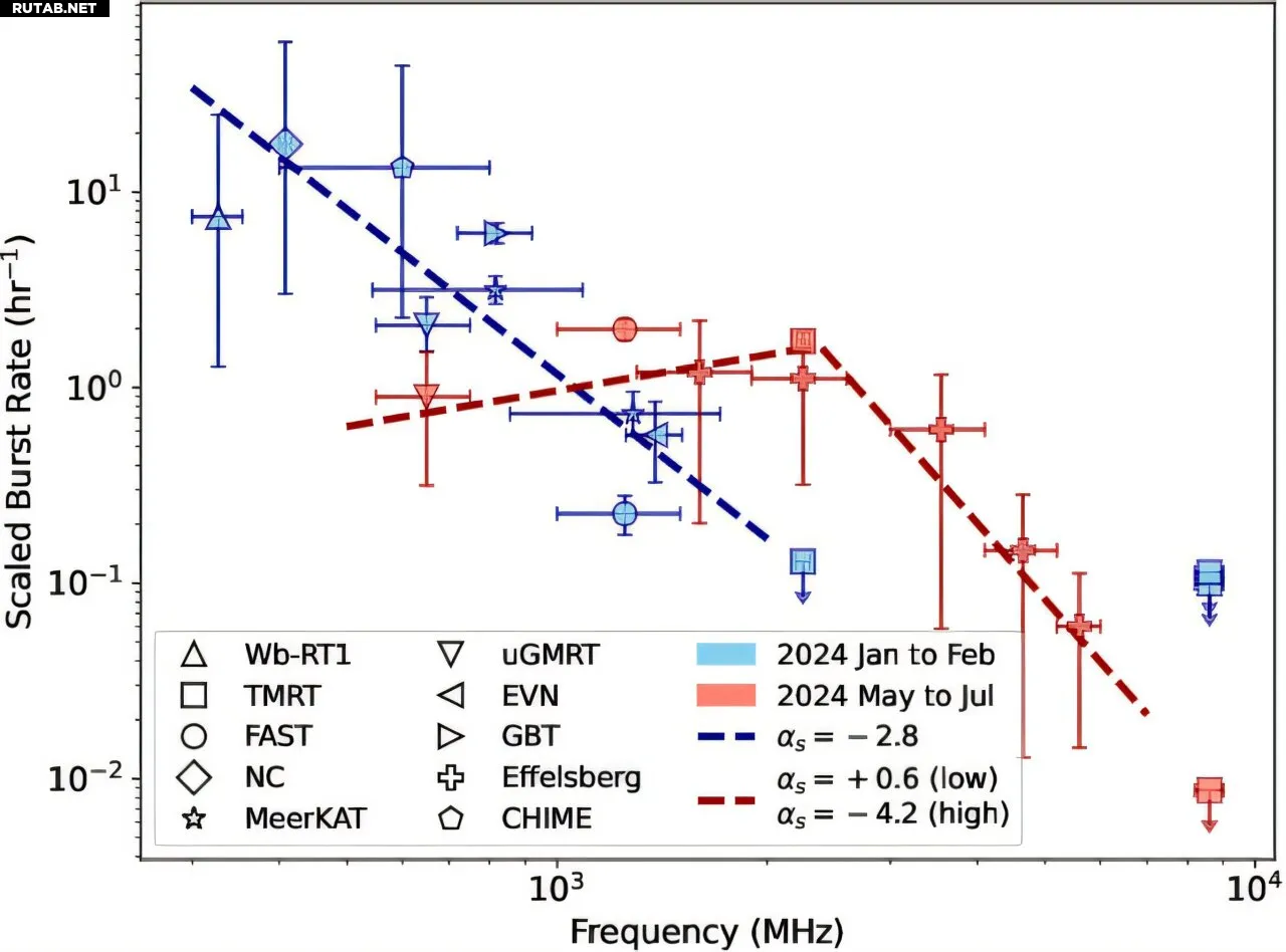 Частота всплесков FRB 20240114A в зависимости от частоты наблюдения в периоды январь-февраль 2024 года (синий) и май-июль 2024 года (красный). Все наблюдения с разных телескопов приведены к порогу обнаружения TMRT, показывая явное изменение частотной зависимости скорости всплесков источника между двумя периодами. Автор: SHAO