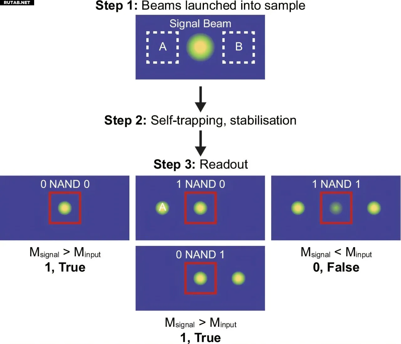 Центральный сигнальный луч всегда направляется в образец. Входы A и B могут быть включены или выключены. После стабилизации лучей итоговая интенсивность используется для определения выхода. Ложный результат получается только когда выходной сигнал подвергается воздействию двух соседних лучей. Автор: Калайчелви Сараванамутту