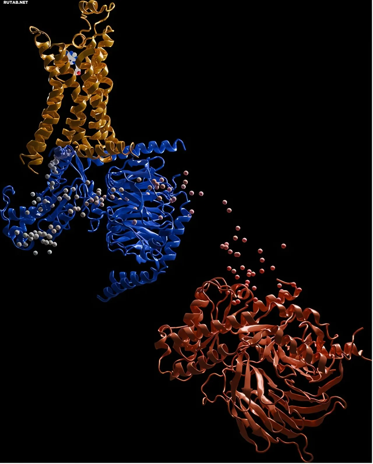 Диссоциация G-белка от связанного с лекарством GPCR (оранжевый) захвачена в ускоренных молекулярно-динамических симуляциях, начиная от связанного состояния (синий) до свободного (красный), с траекторией его C-концевого остатка, окрашенной в сине-бело-красной шкале. Автор: Инлун Мяо, Ан Т. Н. Нгуен и Лорен Мэй