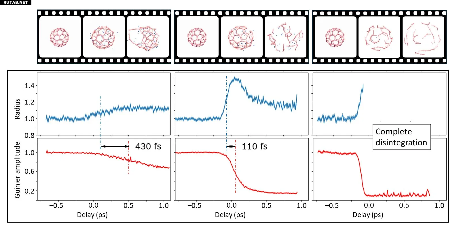 Фуллерен C₆₀, известный своей сферической структурой, напоминающей футбольный мяч, служил модельной системой для изучения динамики сложных молекулярных процессов. Исследователи анализировали два ключевых параметра: средний радиус молекулы R и амплитуду Гинье A, которая характеризует распределение фрагментов при разрушении.