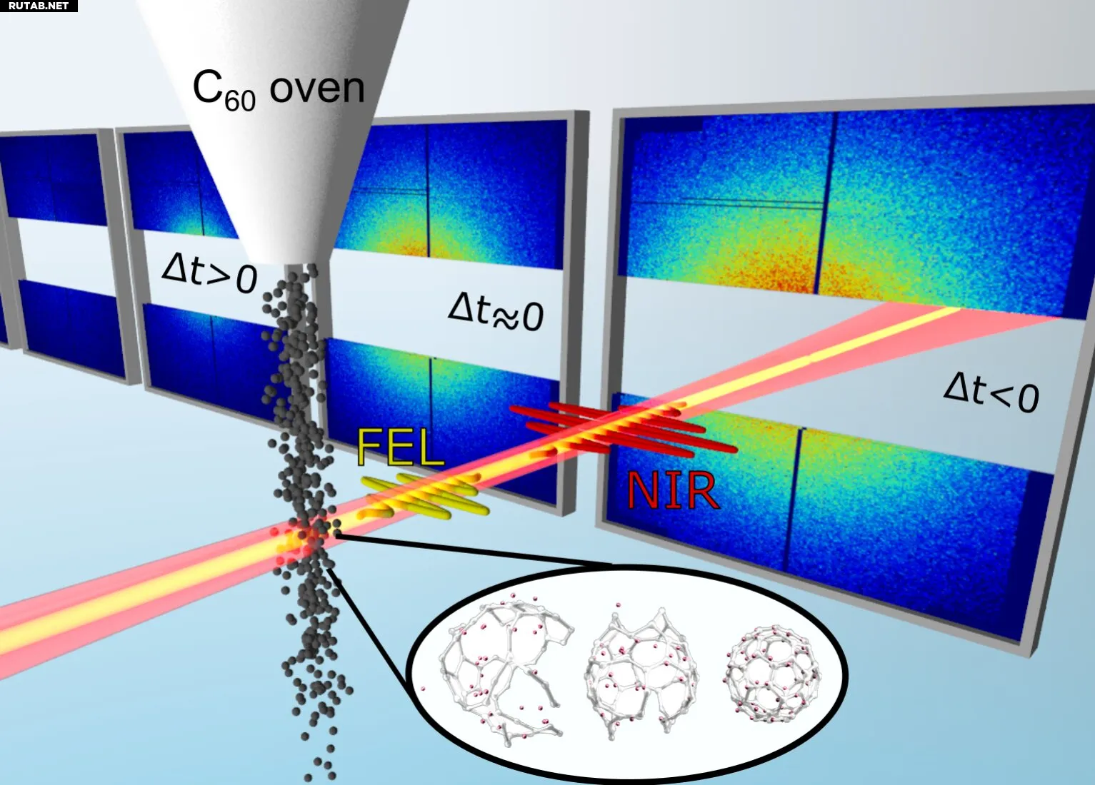 Схема эксперимента: ансамбль молекул C₆₀ возбуждается и ионизируется импульсом ближнего инфракрасного диапазона, после чего фиксируется рентгеновским импульсом. Показаны экспериментальные картины рассеяния для различных временных задержек Δt. Автор: PSI, MPI-PKS