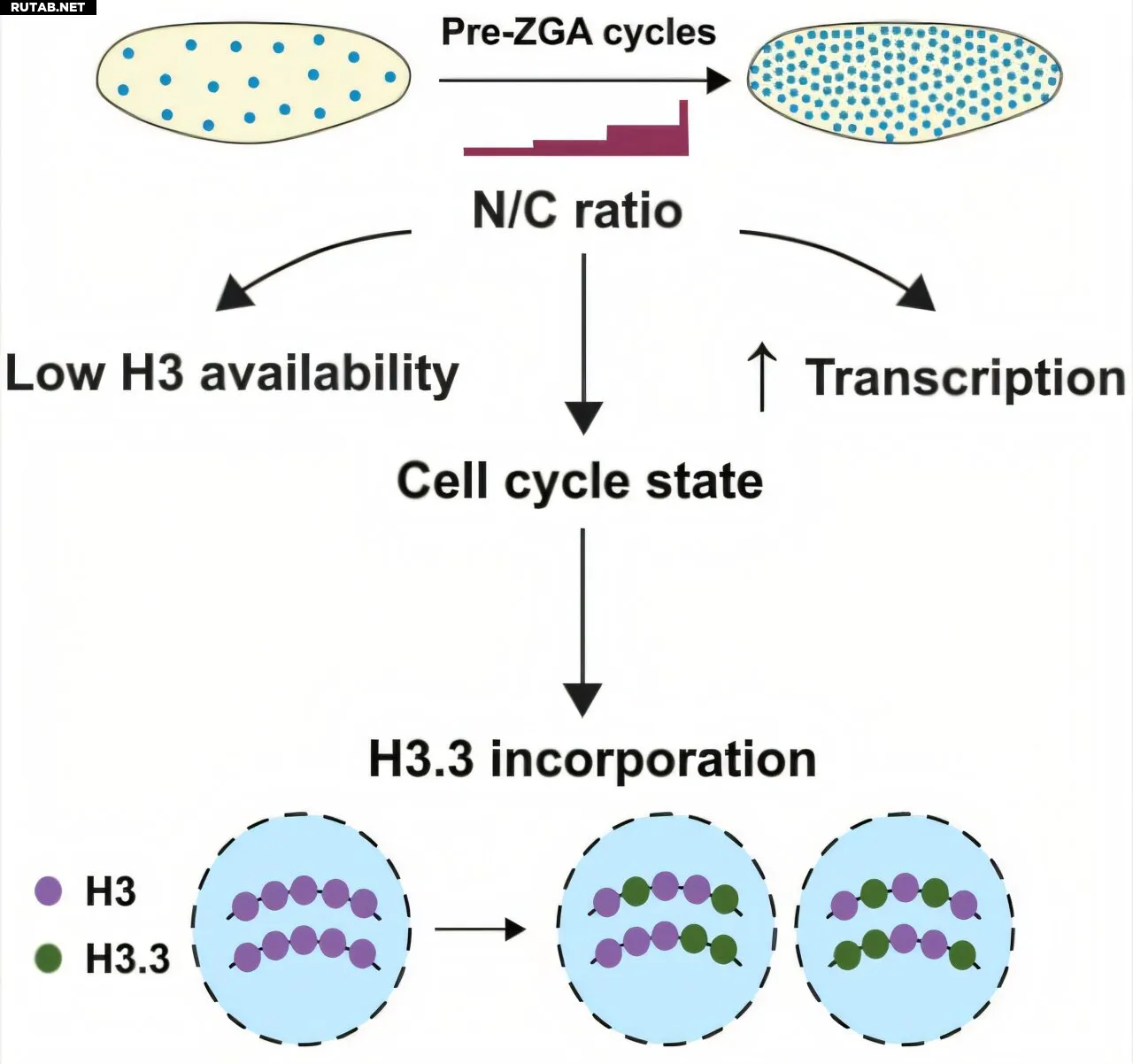 После 13 раундов быстрых делений в одном эмбрионе скапливается более 6000 ядер. Исследователи выяснили, что эта скученность служит сигналом для замены гистона H3 на его вариант H3.3. Гистоны — это белки, вокруг которых, как бусины на нитке, намотана ДНК.