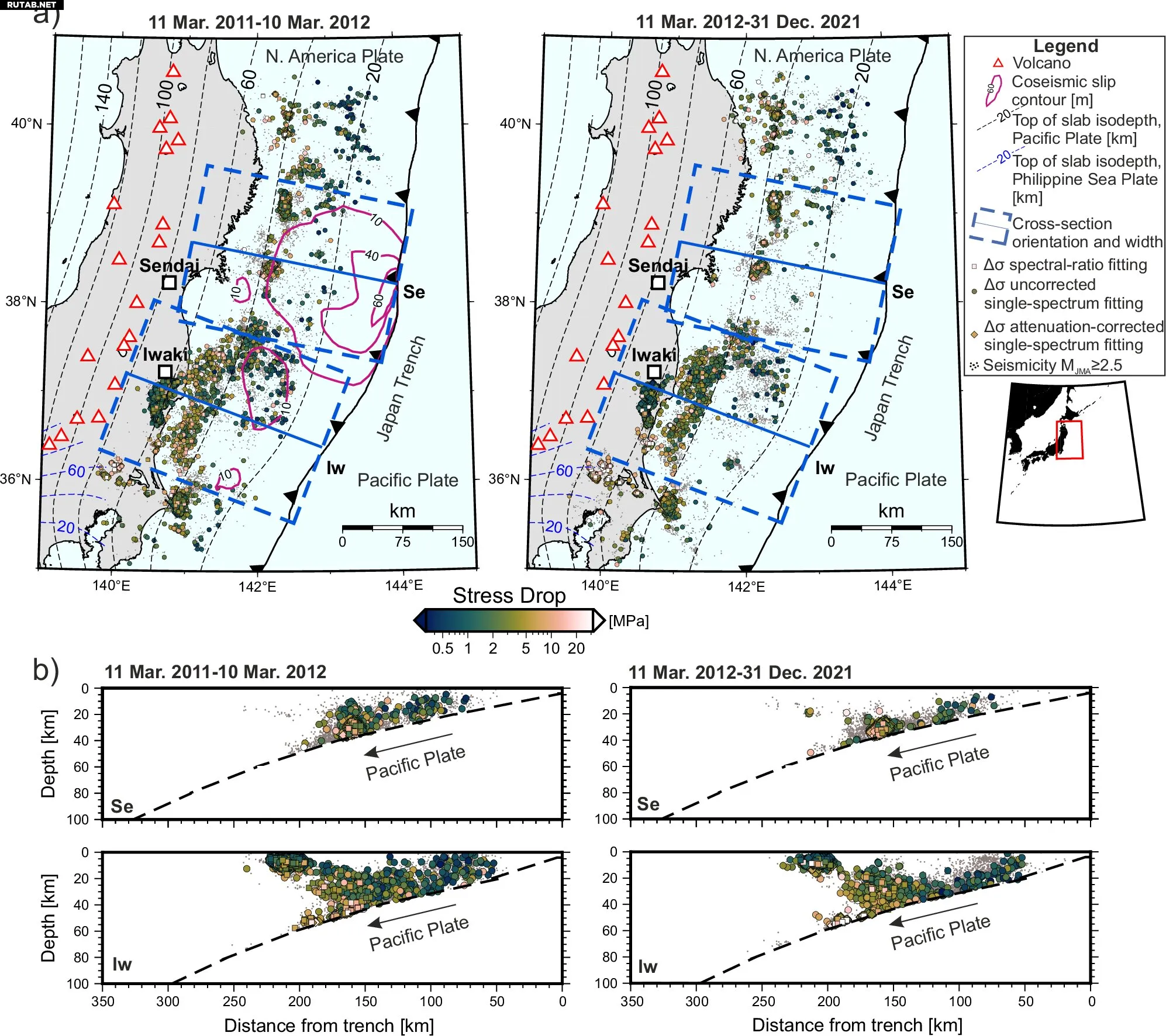 Сейсмичность форланда и оценки сброса напряжений (Δσ) в исследуемом регионе после мощного землетрясения Тохоку-Оки магнитудой 9.0 11 марта 2011 года. Автор: Communications Earth & Environment (2025). DOI: 10.1038/s43247-025-02877-y