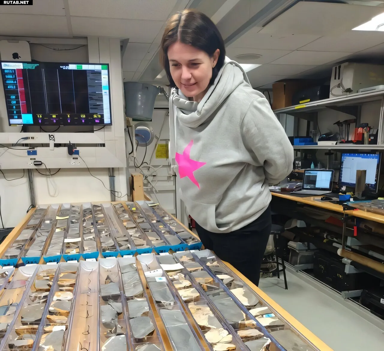 Доктор Розалинда Коггон изучает керны лав верхней океанической коры, отобранные во время экспедиции IODP 390. Автор: Алисса Стивенс, IODP JRSO