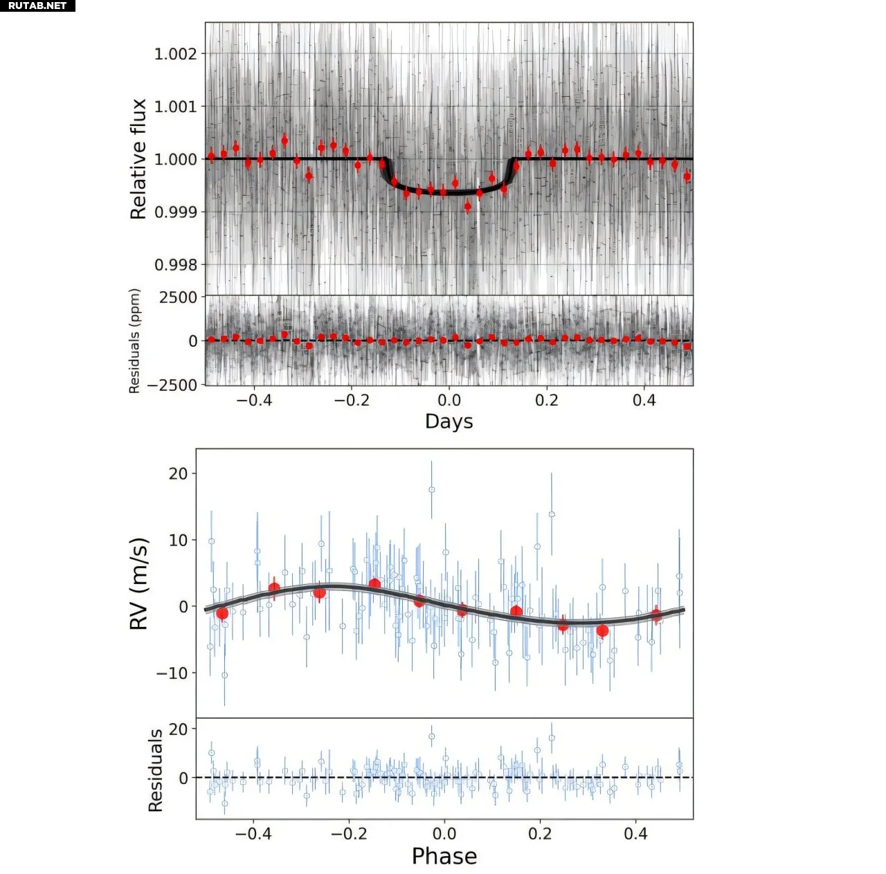 Фазовые транзиты TESS (верхняя панель) и сигнал лучевых скоростей (нижняя панель) TOI-1422 c вместе с наилучшими моделями подгонки (чёрным цветом) и их остатками под каждой панелью. Красные кружки представляют среднее значение за ∼31 минуту и ∼83 часа соответственно, а серые области представляют отклонение 1𝜎 от каждой модели. Автор: arXiv (2025). DOI: 10.48550/arxiv.2511.11492