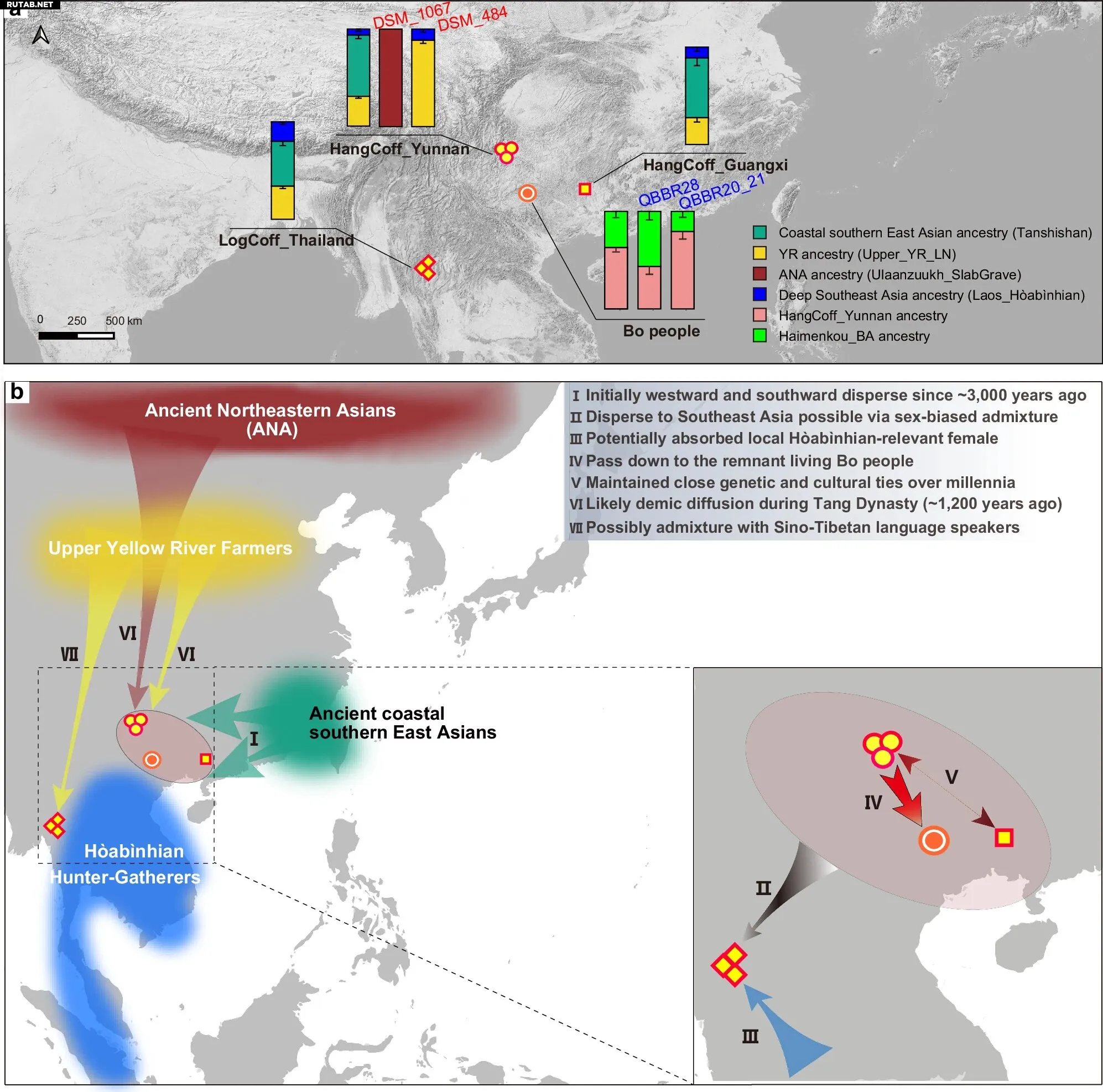 Проведя сравнительный геномный анализ 11 древних индивидов с четырёх мест захоронений в висячих гробах в Китае, четырёх индивидов с мест захоронений в колодах-гробах в Таиланде, а также 30 полных геномов современной популяции бо, профессор Чжан Сяомин из Куньминского института зоологии Китайской академии наук вместе с коллегами обнаружил, что современные представители народа бо демонстрируют значительную степень генетического наследия от древних сообществ, практиковавших захоронение в висячих гробах.