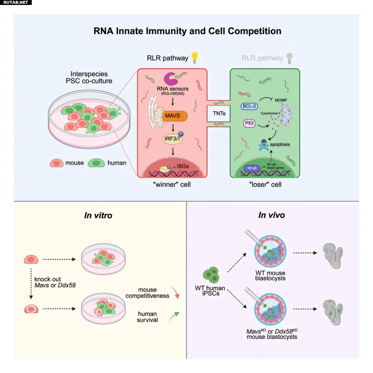 В норме клетки мыши вытесняют человеческие стволовые клетки, что ограничивает возможность создания химерных эмбрионов. Исследователи обнаружили, что клетки мыши делают это, активируя РНК-зависимый иммунный ответ, известный как врожденный иммунитет на основе РНК, когда в клетку попадает чужеродная человеческая РНК. Этот иммунный ответ подавляет человеческие клетки, давая клеткам мыши конкурентное преимущество.