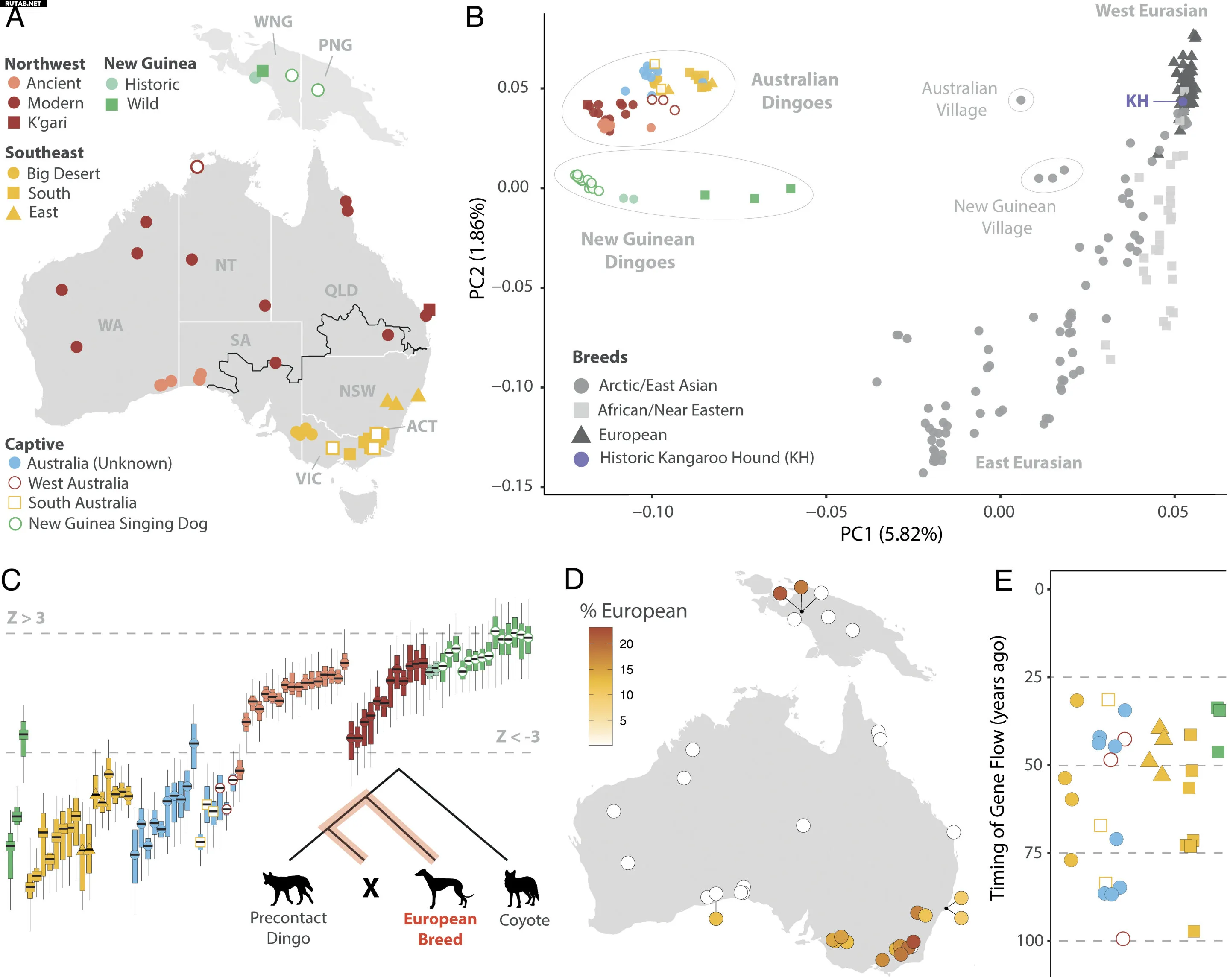 Генетический анализ выявил, что приток генов от европейских собак в популяции динго достиг пика в середине XX века (1960-1980-е годы). Однако, несмотря на историческую гибридизацию, динго сохранили свою уникальную идентичность — особенно в центральной и западной Австралии, где примесь европейских собак минимальна.