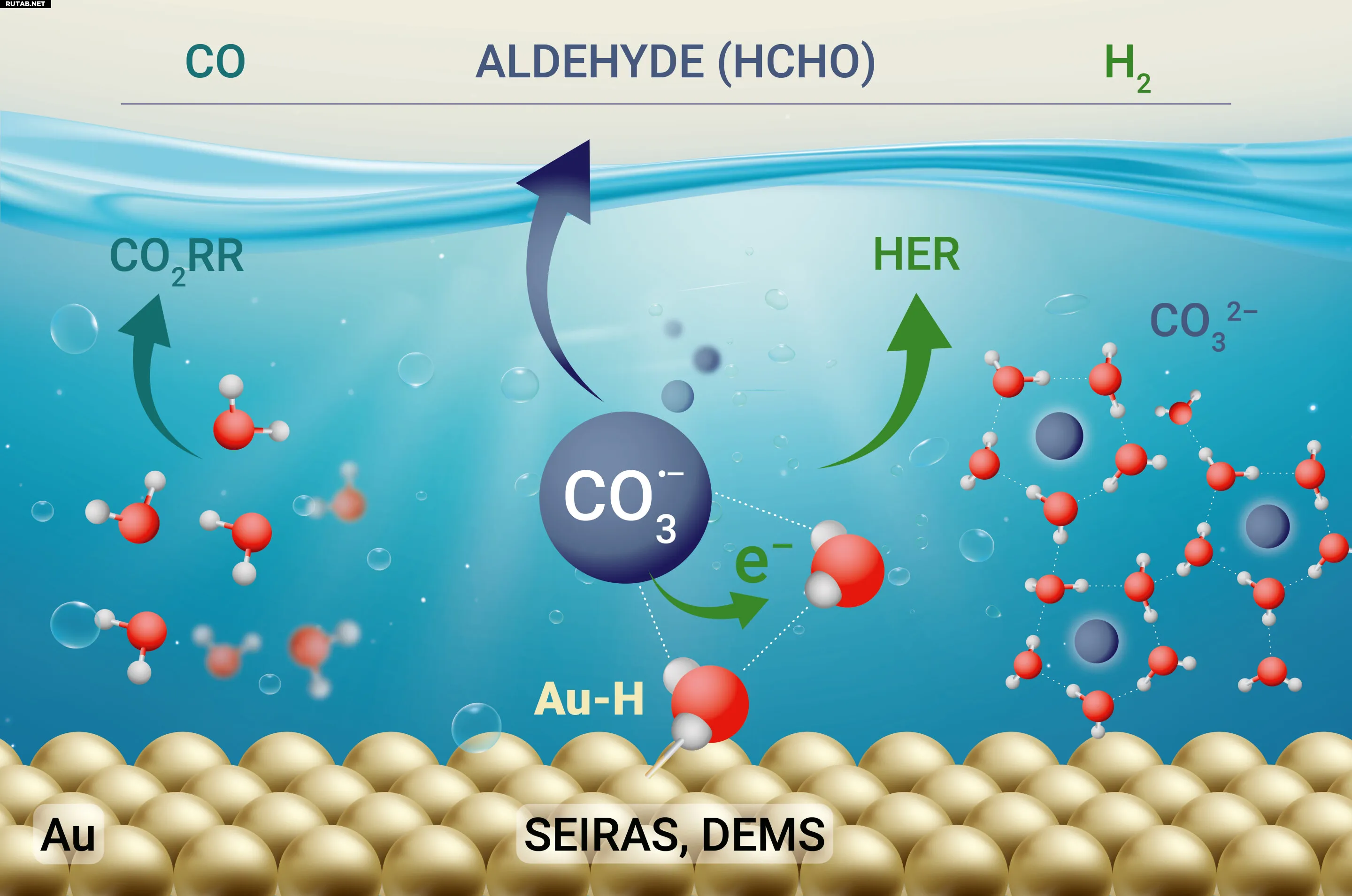 «Это позволило нам обнаружить радикалы карбонат-анионов (CO₃•–), происходящие из гидратированного карбоната. Карбонаты способствуют молекулярному упорядочиванию в гидратационных слоях на границе раздела, а радикалы действуют как протонный реле и облегчают перенос заряда на золото, ускоряя выделение водорода», — объясняет доктор Чжоу, первый автор исследования.