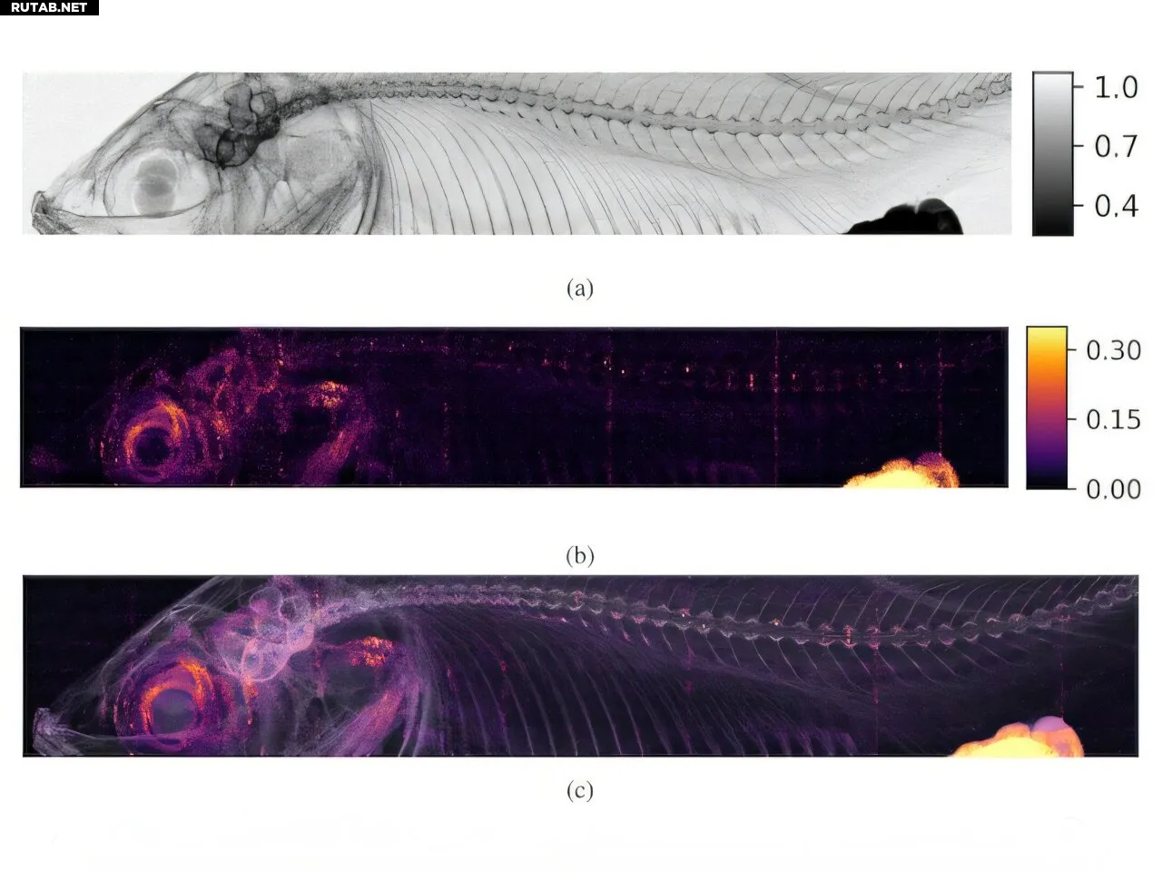 Изображения высушенной рыбы, полученные с новой конфигурацией: (a) контраст ослабления, (b) тёмное поле, (c) комбинация сигналов