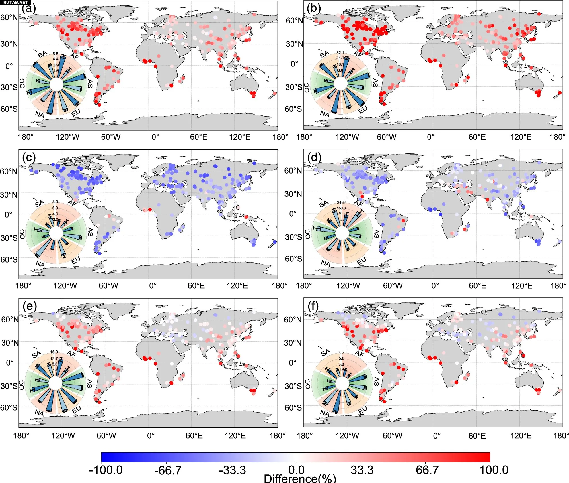 Глобальное распределение среднегодовых показателей волн жары и различия для озёрных и атмосферных волн жары. Автор: Communications Earth & Environment (2025). DOI: 10.1038/s43247-025-02907-9