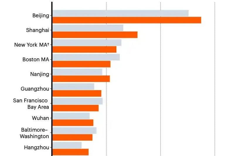 Согласно индексу Nature за 2025 год, шесть китайских городов вошли в первую десятку мировых научных центров. Пекин в девятый раз подряд сохранил звание ведущего научного города мира, увеличив объем исследований более чем на 9%. Шанхай, Гуанчжоу, Ухань, Нанкин и Ханчжоу также заняли места в топ-10, причем Шанхай показал рост почти на 20%.