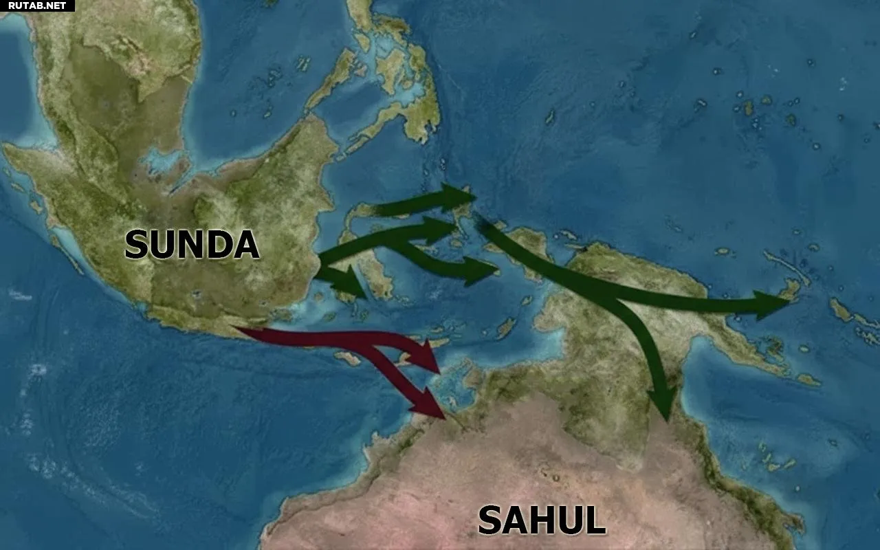 Карта Сунды и Сахула, иллюстрирующая возможные северный и южный миграционные пути, выявленные генетическим анализом. Основано на карте Хелен Фарр и Эриха Фишера.