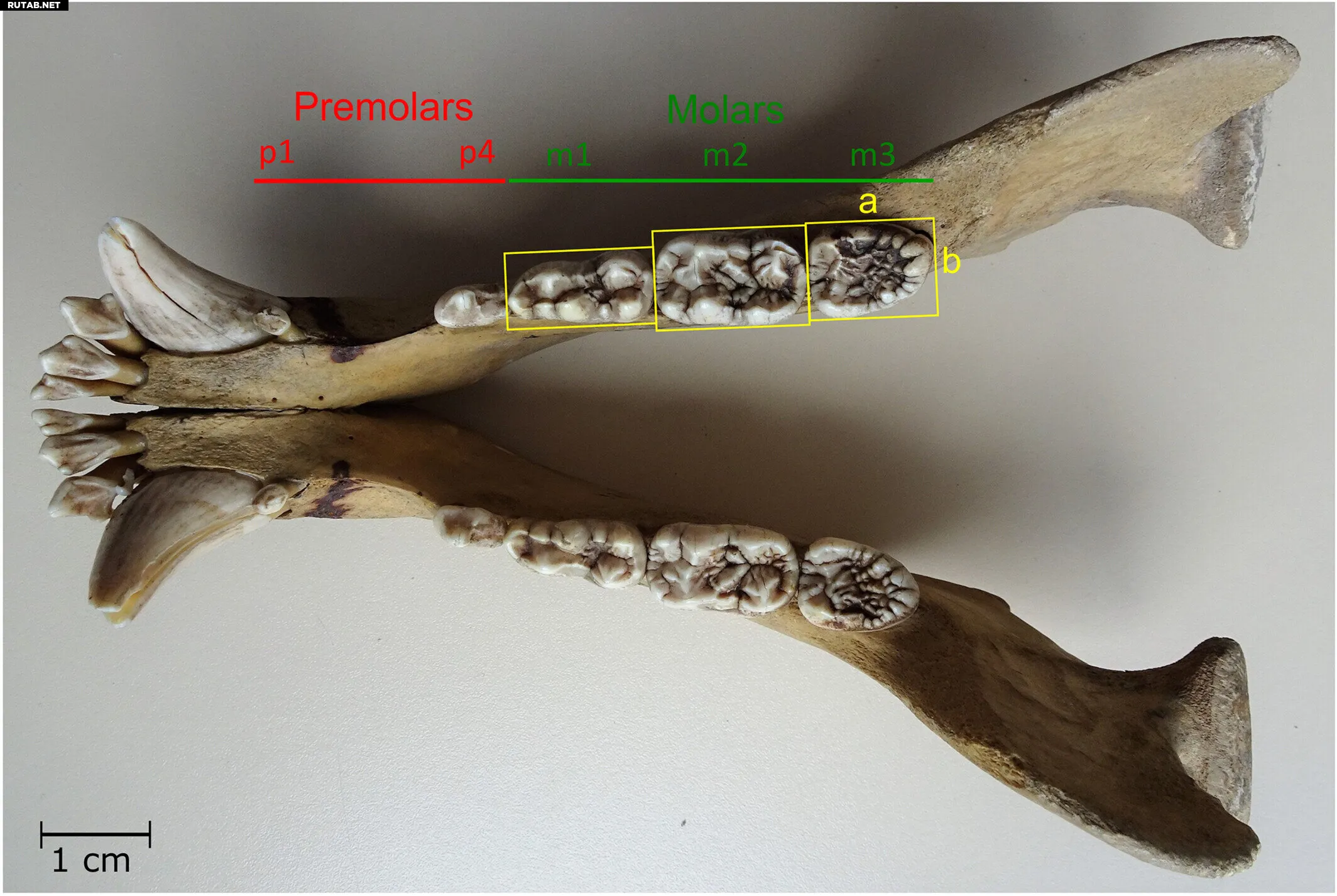 У большинства млекопитающих рост коренных зубов в нижней челюсти описывается моделью ингибиторного каскада (ICM). Согласно ей, размер первого моляра влияет на размер всех последующих зубов. У хищников первый моляр обычно крупнее третьего, а у травоядных — наоборот.Челюсть Ursus deningeri, предка пещерного медведя. Автор: Anneke H. van Heteren, SNSB.
