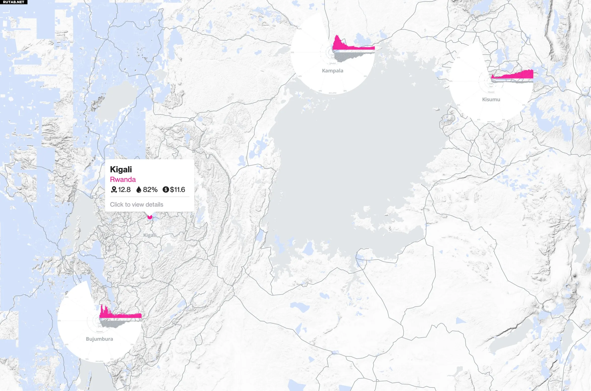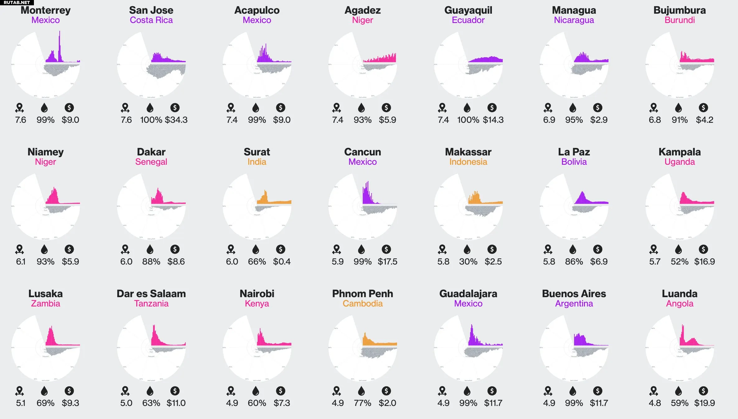 На визуализации показаны более 100 городов Глобального Юга, их разреженность (распределение населения), доступ к чистой воде и тарифы на воду. Автор: Complexity Science Hub
