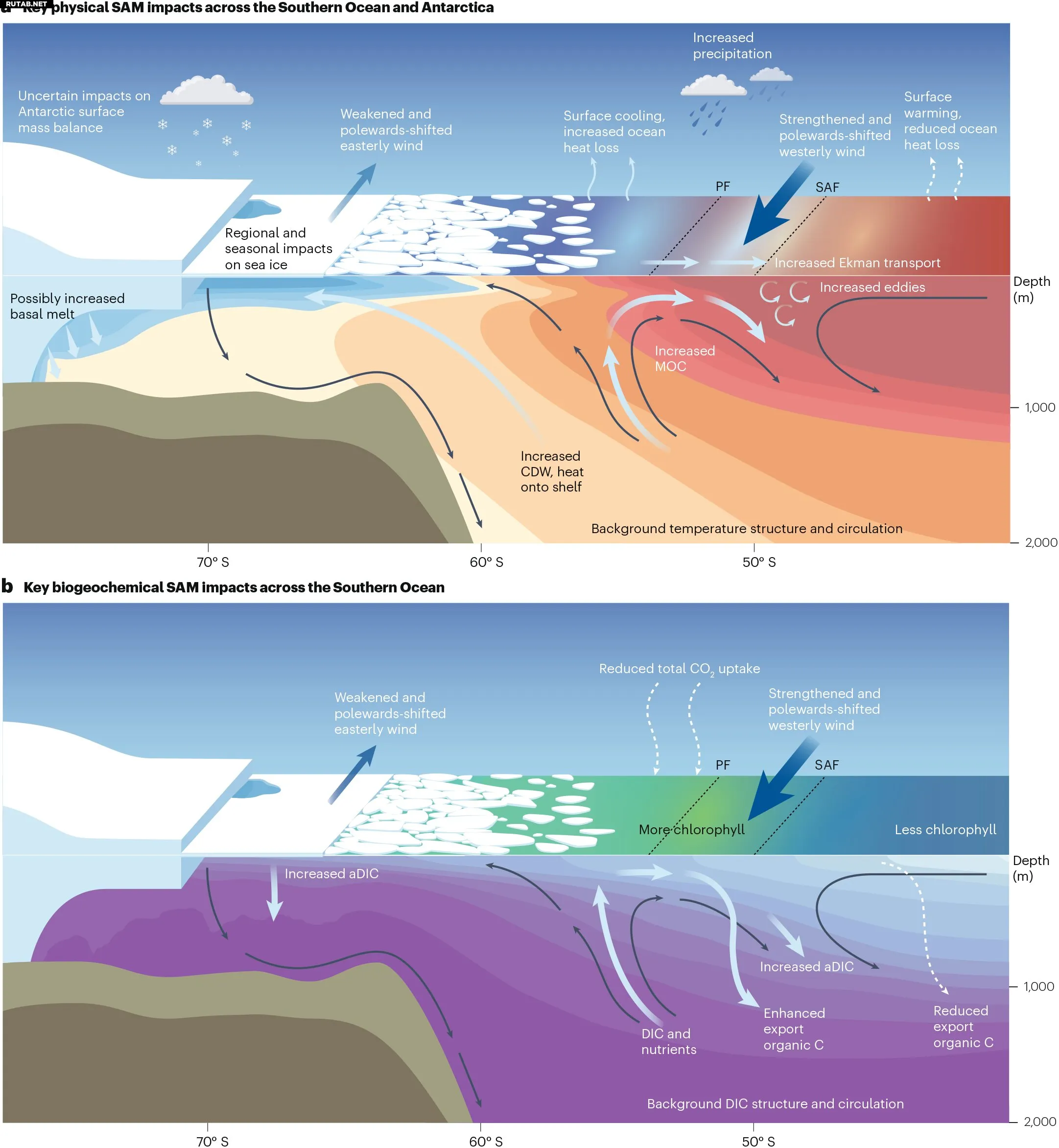 Новый обзорный доклад показал, что Южная кольцевая мода (SAM) — ключевой климатический фактор Южного полушария — находится в самом положительном состоянии за более чем 1000 лет. Если выбросы парниковых газов продолжат расти, этот тренд сохранится на протяжении всего XXI века, что окажет долгосрочное влияние на Антарктиду и Южный океан.