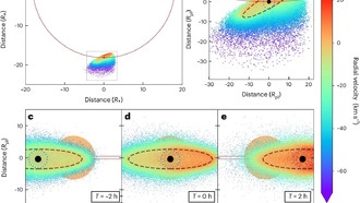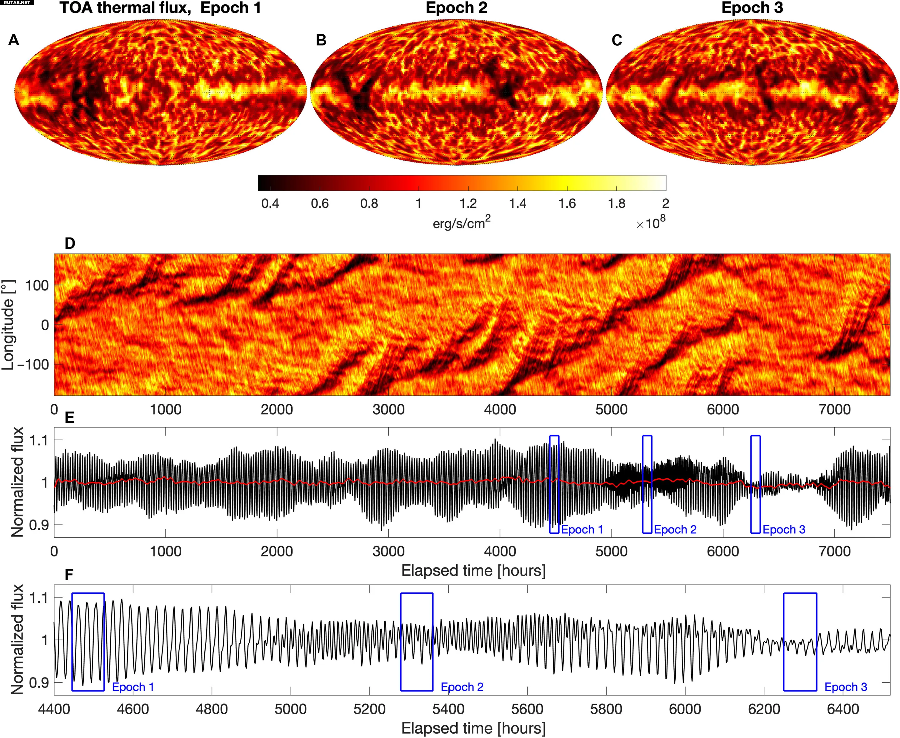 Коричневые карлики — объекты, масса которых больше планеты-гиганта, но меньше маленькой звезды. Некоторые из них, в 10 раз массивнее Юпитера, называются супер-Юпитерами и служат аналогами для изучения атмосфер экзопланет. Исследователи под руководством Шанхайского университета Цзяо Тун смоделировали атмосферу супер-Юпитера VHS 1256B, чтобы объяснить его сильные колебания яркости. Оказалось, что причина — не стабильные шторма, как на Юпитере, а крупномасштабные экваториальные волны, создающие гигантские пылевые бури. Этот механизм, известный как «облачно-радиационная обратная связь», принципиально отличается от юпитерианского.Карты теплового потока и эволюция кривой блеска из модели общей циркуляции атмосферы. Автор: Science Advances (2025). DOI: 10.1126/sciadv.adv3324