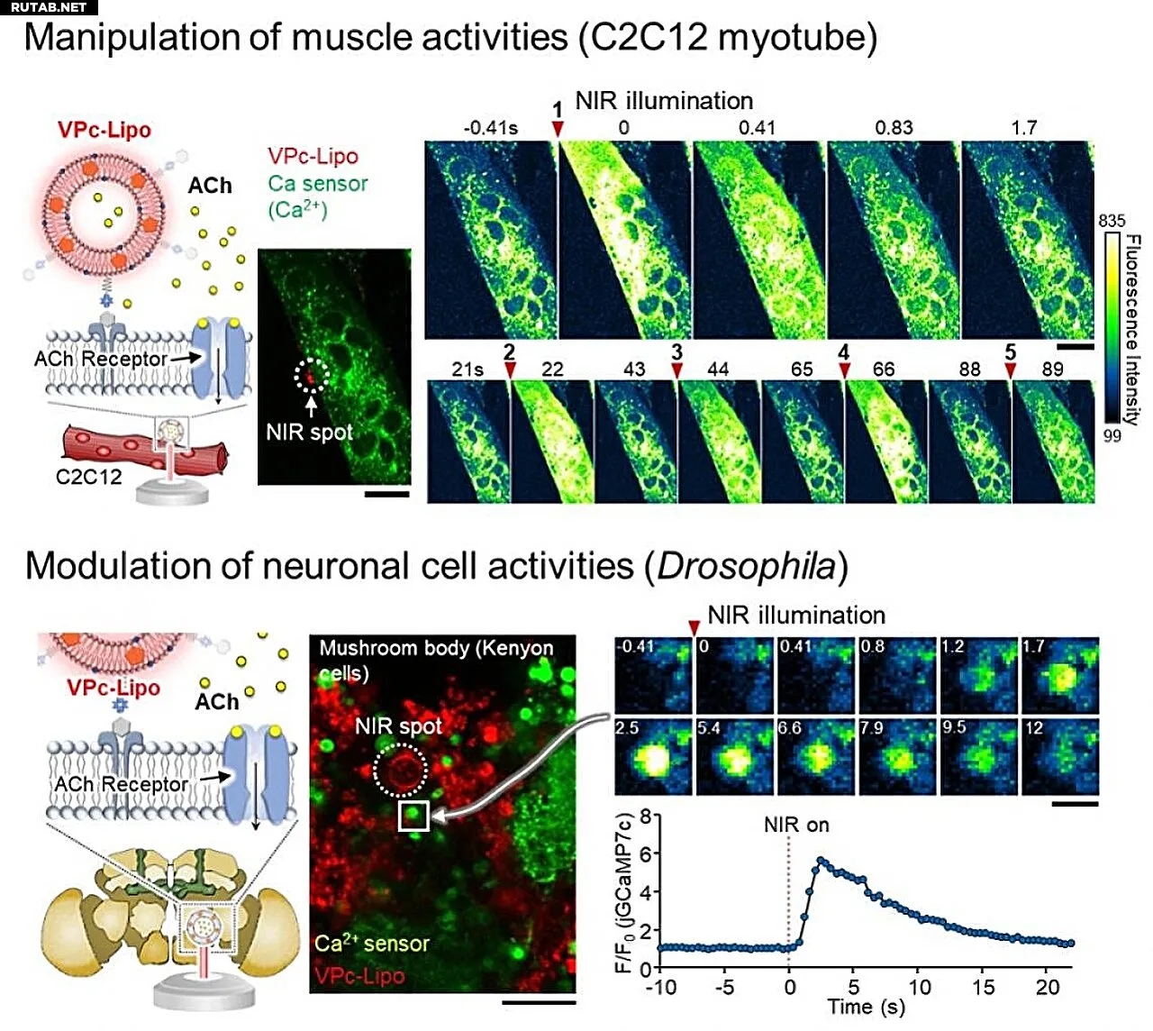 В лабораторных экспериментах исследователи инкапсулировали ацетилхолин в липосомы с VPc и показали, что импульсы БИК-света могут запускать быстрое высвобождение нейромедиатора в заданных местах. Этого высвобождения было достаточно, чтобы вызвать кальциевый поток в мышечных клетках и нейронные ответы в мозге дрозофилы. Молекулярно-динамическое моделирование подтвердило, что VPc предпочтительно локализуется внутри липидных мембран, обеспечивая эффективное тепловое ограничение.