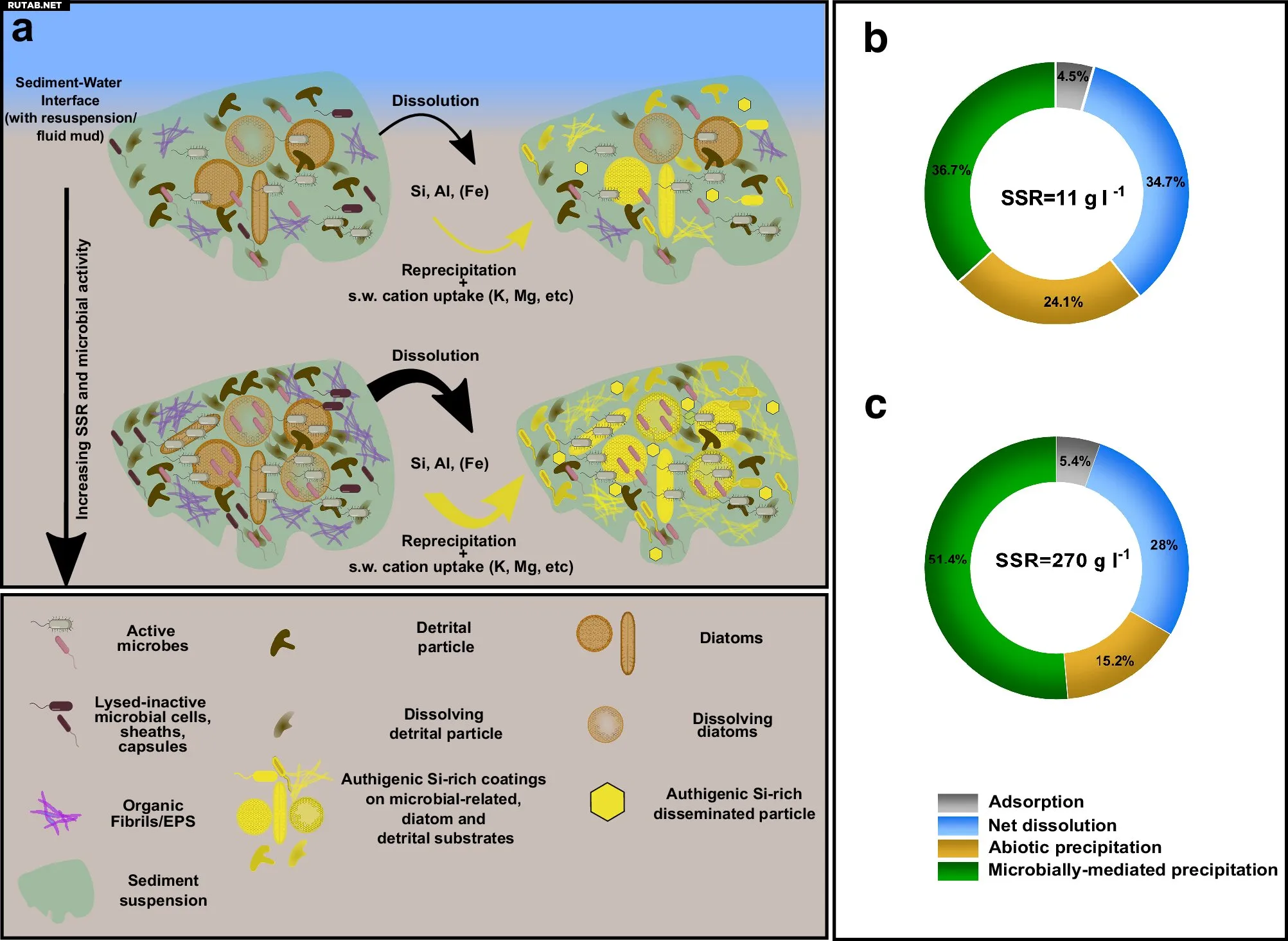 Второе исследование в Communications Earth & Environment с использованием радиоактивных трассеров показало, что микроорганизмы ускоряют поглощение кремния и формирование осадков в 3,5 раза по сравнению с неживой средой. Микробы способны растворять существующий кремний и преобразовывать его в новые минеральные фазы за считанные дни.