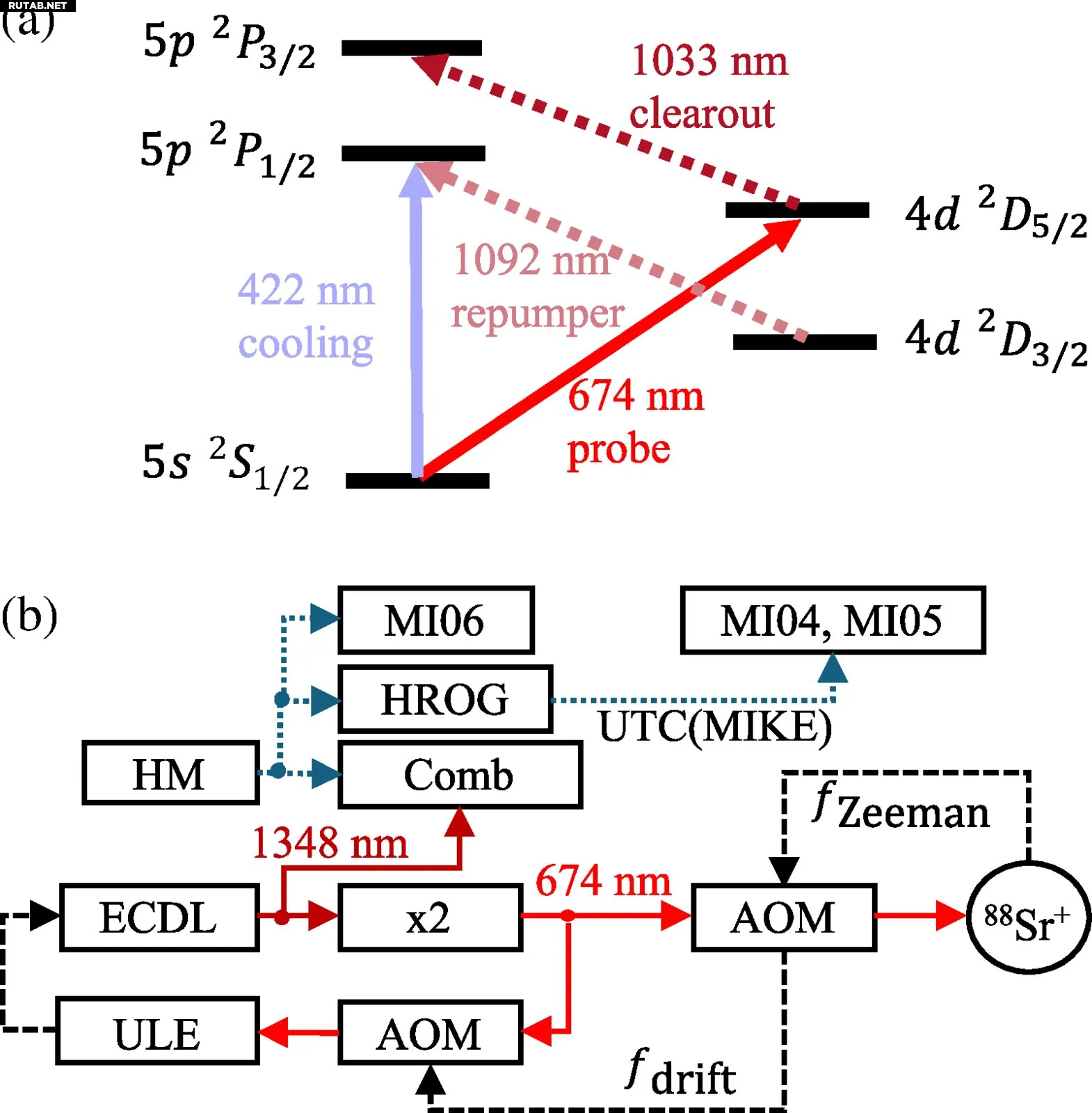(a) Частичная схема энергетических уровней иона 88Sr+. (b) Экспериментальная установка с лазером для часов, частотной гребёнкой, водородным мазером (HM) и геодезическими GNSS-приёмниками для передачи времени. Автор: Physical Review Applied (2025). DOI: 10.1103/czlf-bfvp
