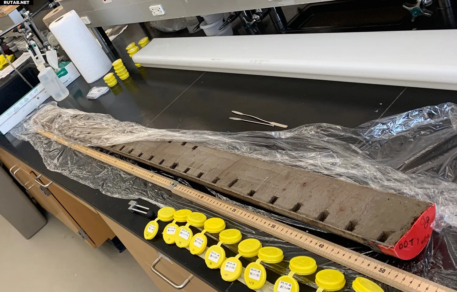 Керн осадков озера Стоунмен под анализом в лаборатории. Фото: Спенсер Стэйли.