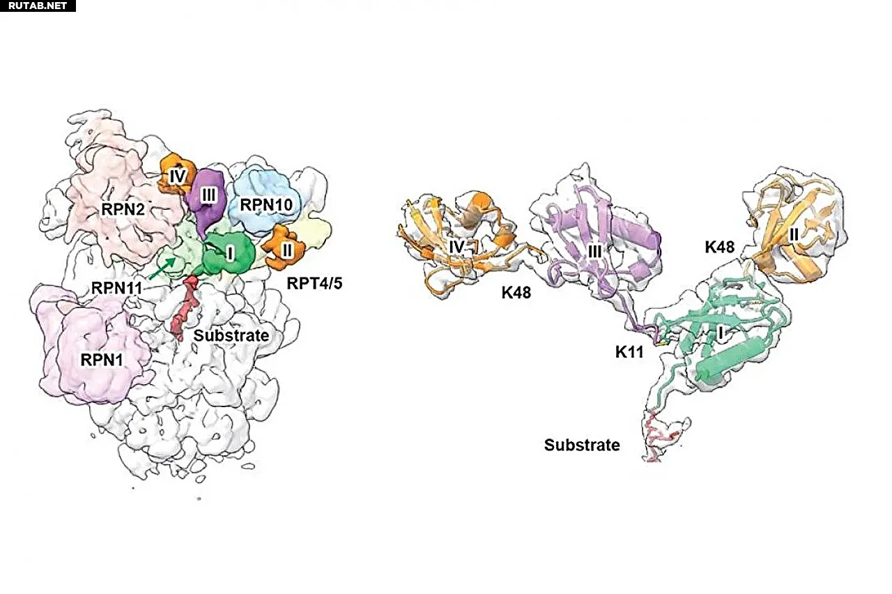 Работа, опубликованная в журнале Nature Communications, показывает, что субъединица RPN2 регуляторной частицы 19S содержит ранее неизвестный сайт связывания, специфичный для K11-связей. Вместе с другими субъединицами, такими как RPN10, RPN8 и RPT4/5, формируется мультивалентная бороздка, настроенная на цепи убиквитина, связанные по K11. Это потенциально обеспечивает более высокое сродство и специфичность, ускоряя распознавание субстрата и его деградацию.
