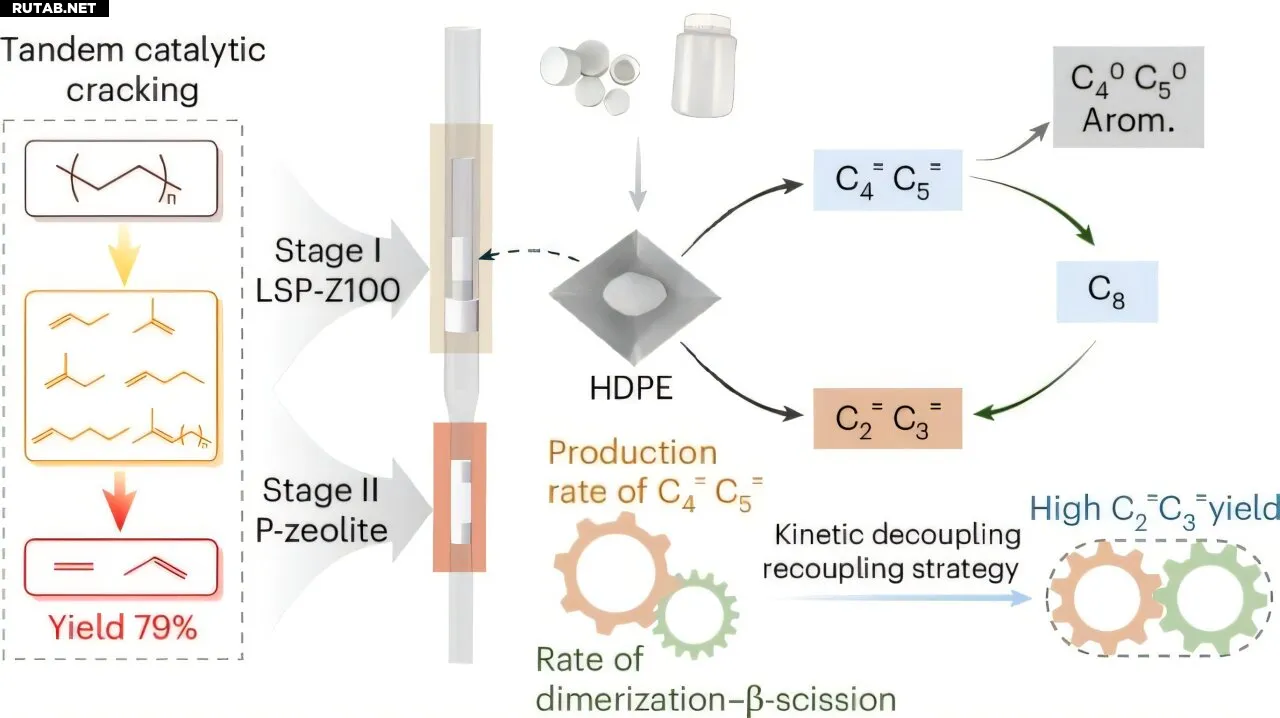 На первой стадии при температуре 260°C слоистый цеолит (LSP-Z100) селективно расщепляет полиэтилен на промежуточные соединения, в основном бутены и пентены. На второй стадии, при 540°C, фосфор-модифицированный цеолит (P-HZSM-5) преобразует эти промежуточные продукты в этилен и пропилен через реакцию димеризации-β-расщепления.