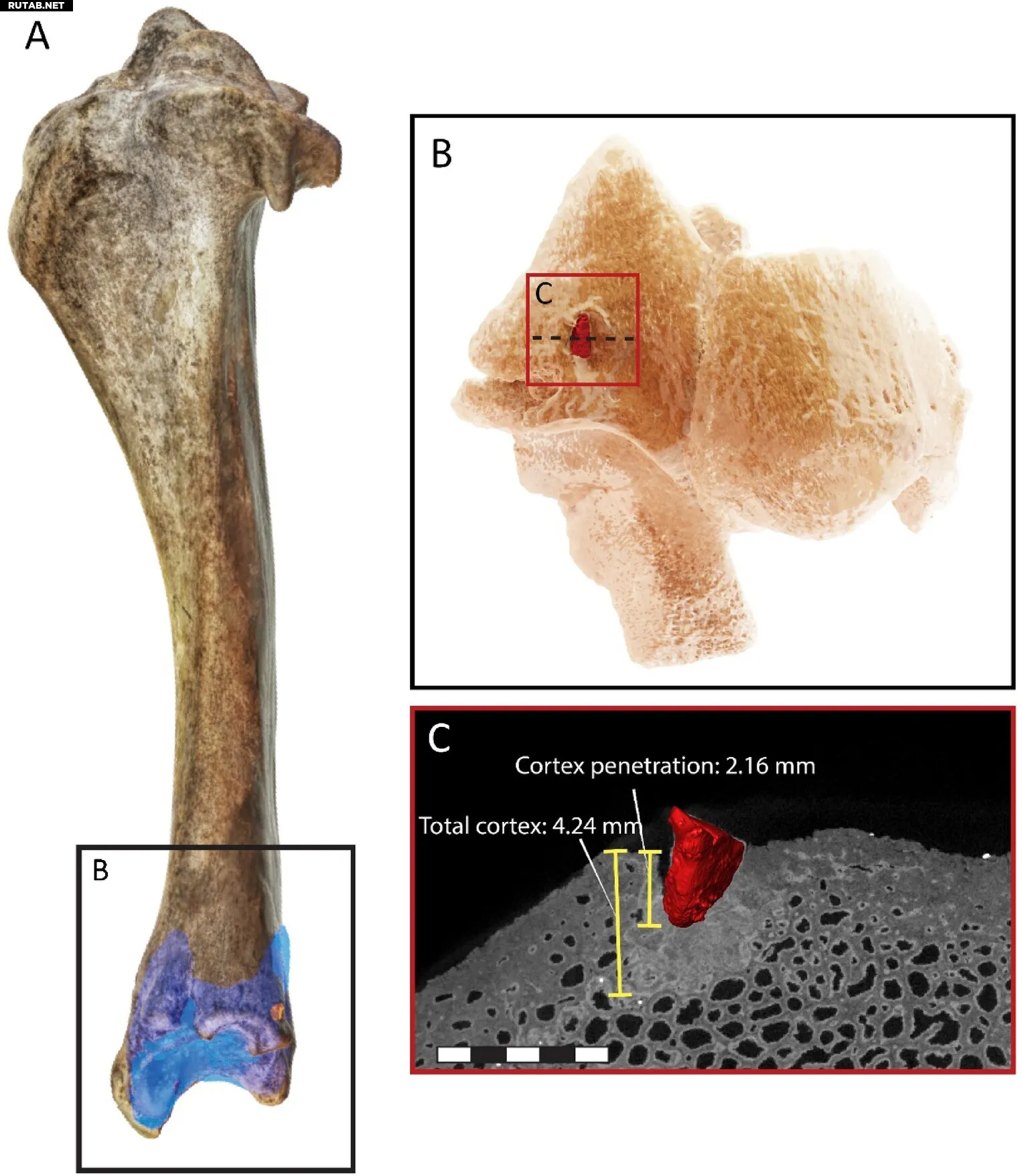 Кремнёвый осколок, застрявший в кости тура. Автор: Scientific Reports (2025). DOI: 10.1038/s41598-025-26274-9