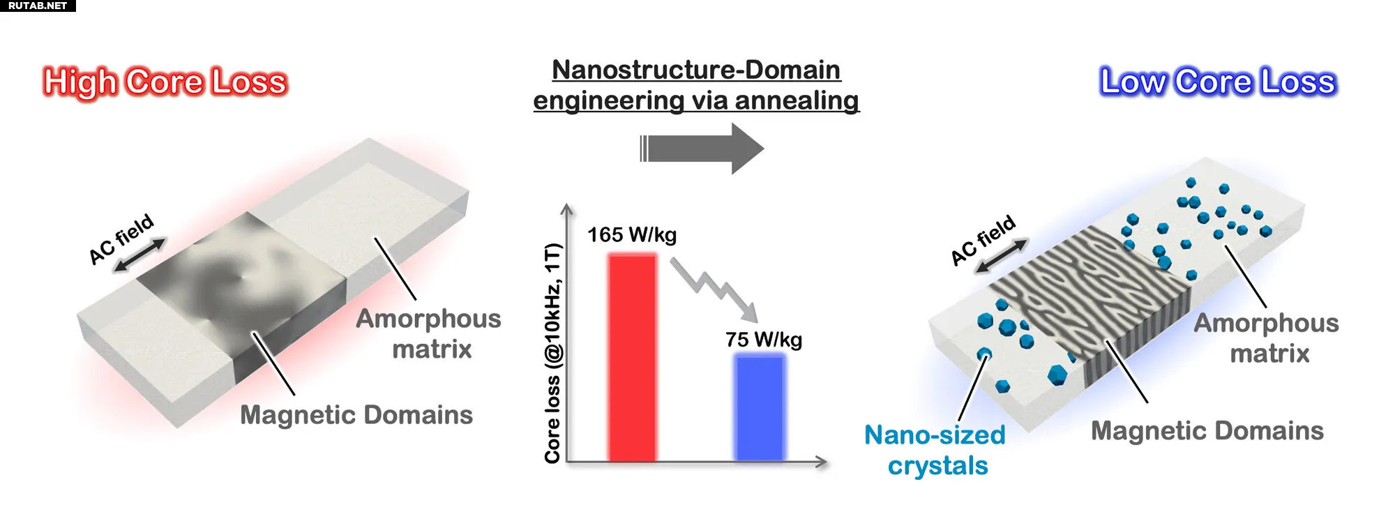 Совместная исследовательская группа разработала новую методику точного управления наноструктурами и магнитными доменными структурами внутри железных мягких аморфных лент. Используя эту технику, им удалось добиться снижения потерь в сердечнике более чем на 50% по сравнению с исходными аморфными лентами, особенно в высокочастотном диапазоне.