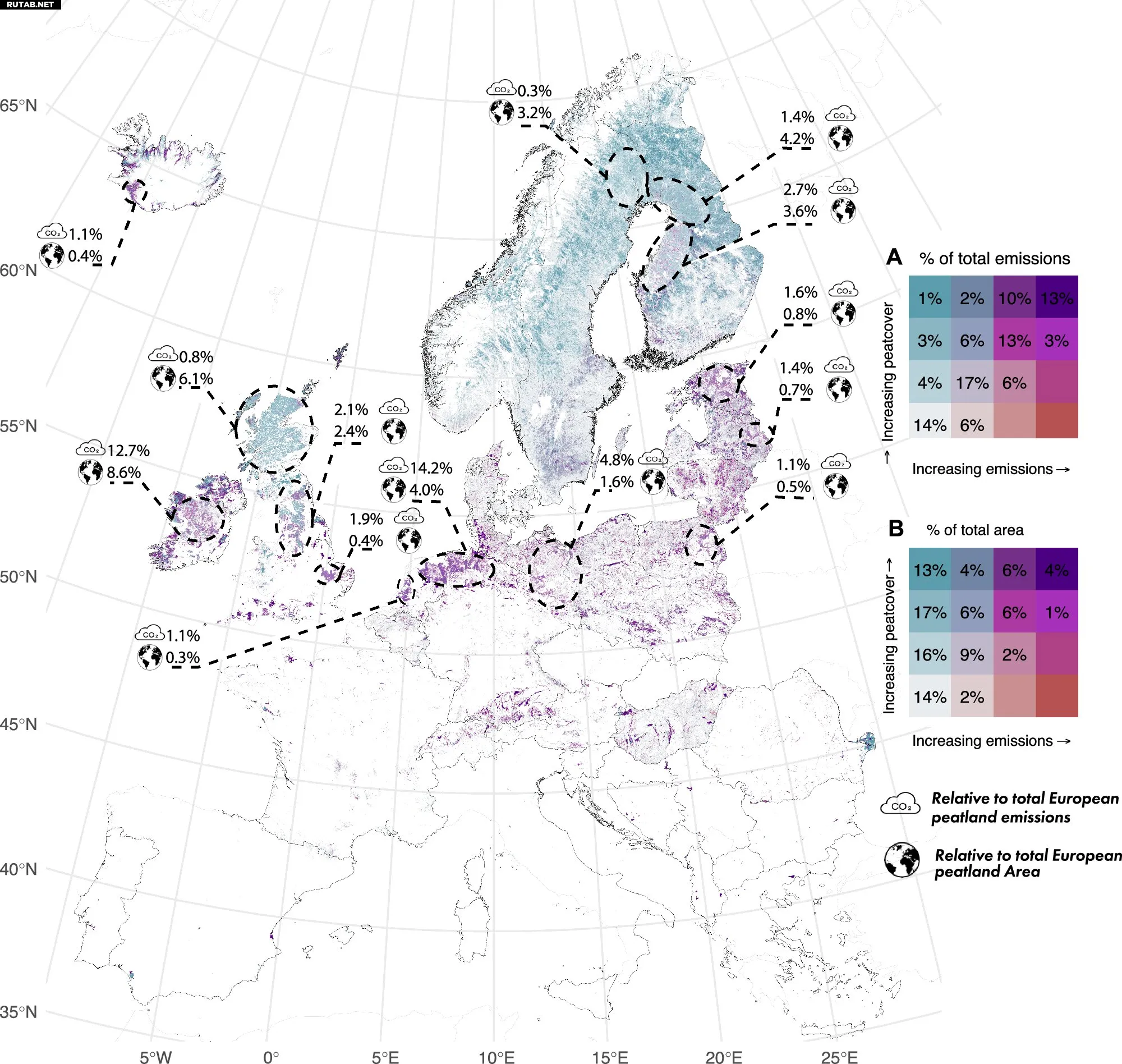 Выбросы распределены неравномерно: 17% торфяников ответственны за 39% эмиссии. Крупнейшие «горячие точки» расположены на северо-востоке Нидерландов и северо-западе Германии. Высокие уровни выбросов также отмечены в регионах Англии, странах Балтии, Польше и Ирландии.
