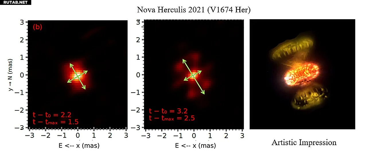Были изучены две новые, вспыхнувшие в 2021 году. Одна из них, V1674 Геркулеса, оказалась одной из самых быстрых в истории. На снимках видны два отдельных перпендикулярных потока газа, что указывает на множественные взаимодействующие выбросы. Вторая звезда, V1405 Кассиопеи, эволюционировала медленнее и удерживала внешние слои более 50 дней перед выбросом, что стало первым чётким свидетельством отсроченного извержения.