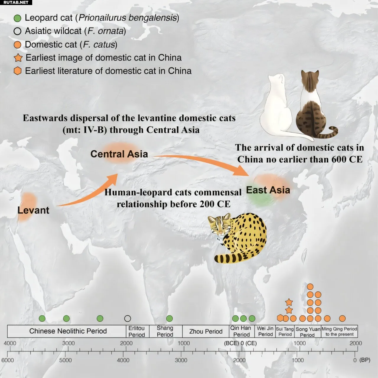Домашние кошки (Felis catus) прибыли в регион значительно позже, в эпоху династии Тан (618–907 гг. н.э.), вероятно, будучи завезёнными по евразийским торговым путям, связанным с Великим шёлковым путём. Эти выводы, опубликованные в журнале Cell Genomics, проясняют давний спор о том, когда и как домашние кошки впервые появились в Китае.