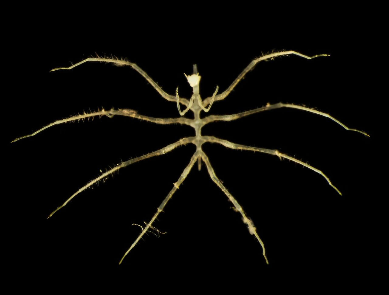 Морской паук. Этот вид родственен сухопутным паукам, но не принадлежит к их группе. В глубоководье у Антарктиды они могут достигать размера ладони, но этот конкретный вид имеет размер всего в несколько миллиметров. Автор: Natural History Museum, London & Göteborgs universitet