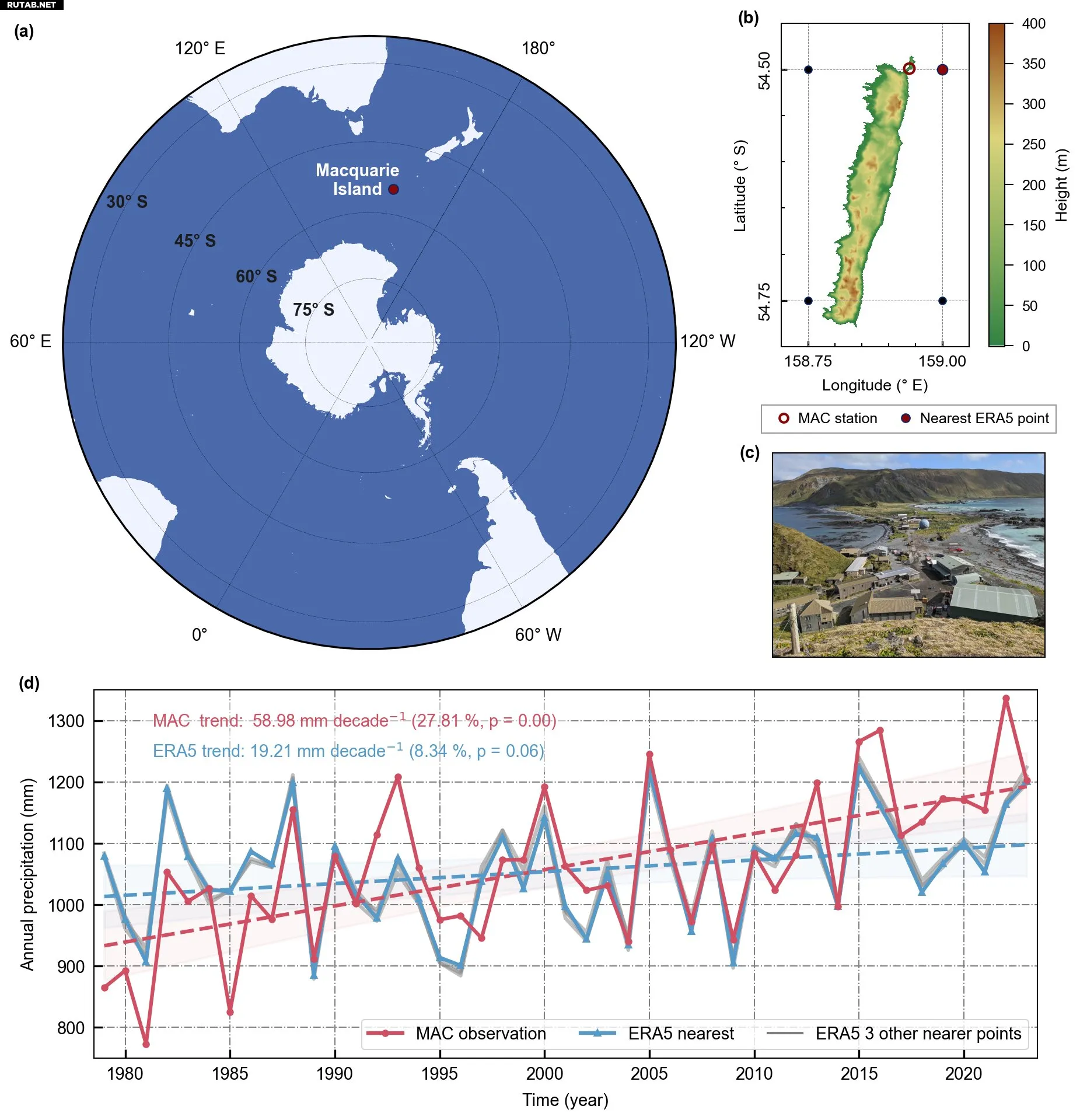 (a) Расположение острова Маккуори (MAC, красная точка) в Южном океане. (b) Карта высот острова. (c) Фотография станции. (d) Сравнение тенденций годовых осадков с 1979 по 2023 год. Автор: Weather and Climate Dynamics (2025).