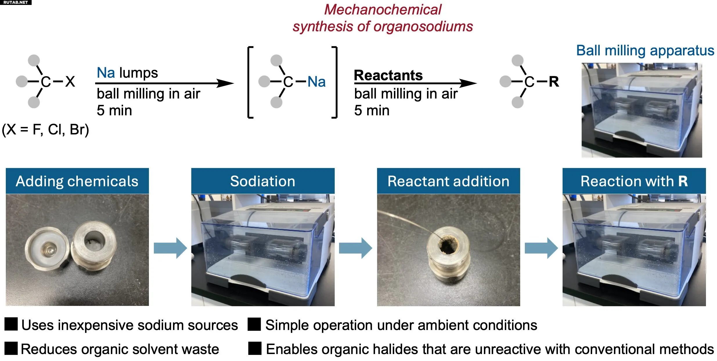 Новая стратегия использует технику механохимии в шаровой мельнице. Учёные показали, что органо-натриевые реагенты можно получить всего за пять минут, обрабатывая органические галогениды кусками металлического натрия в мельнице с небольшим количеством гексана. Полученные реагенты успешно вступали в реакции с различными соединениями, давая новые продукты с высоким выходом.