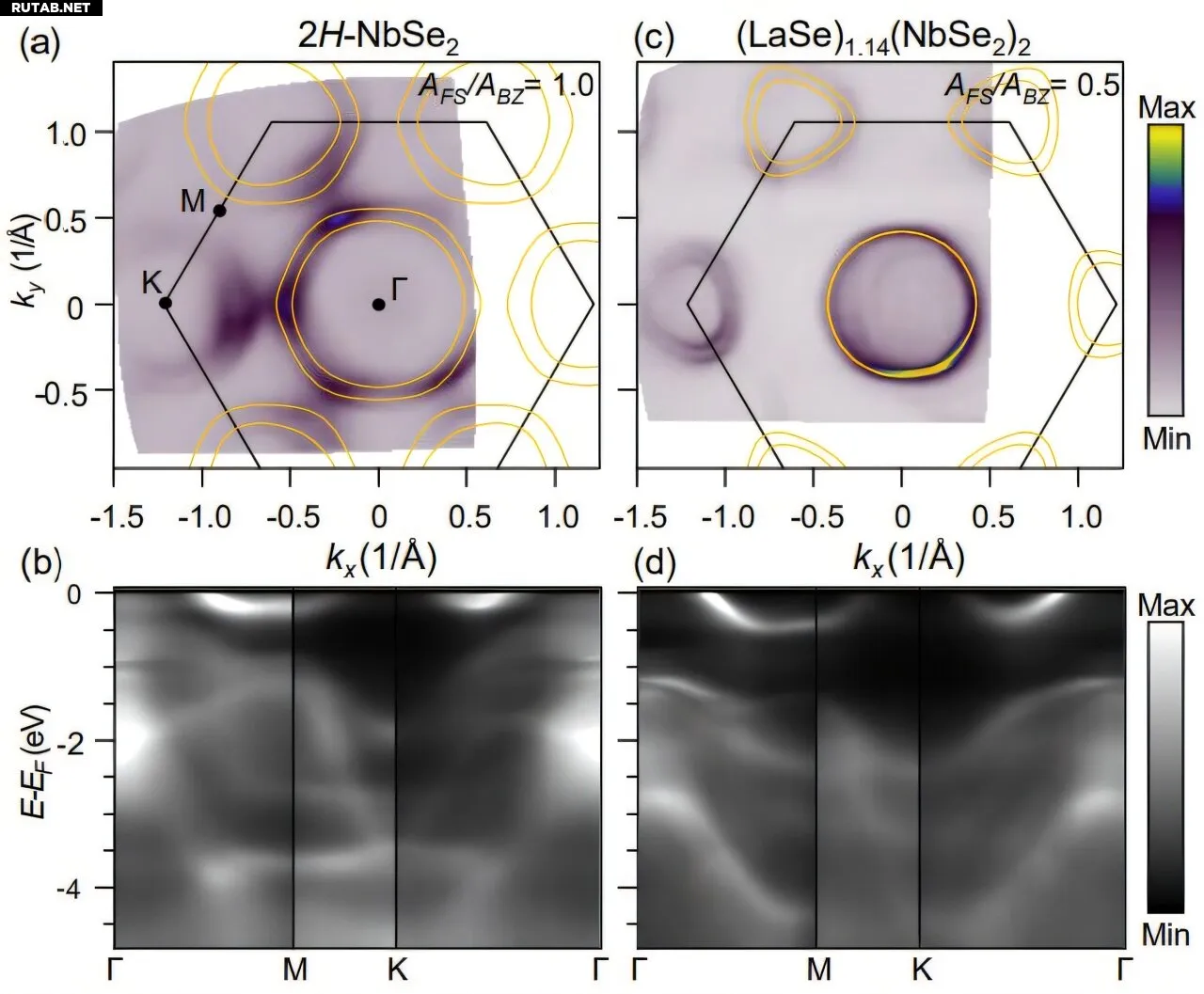 Поверхности Ферми (верхний ряд) и структура валентной зоны (нижний ряд) для 2H-NbSe2 (a,b) и кристаллов (LaSe)1.14(NbSe2)2 (c,d). Автор: arXiv DOI: 10.48550/arxiv.2407.05465