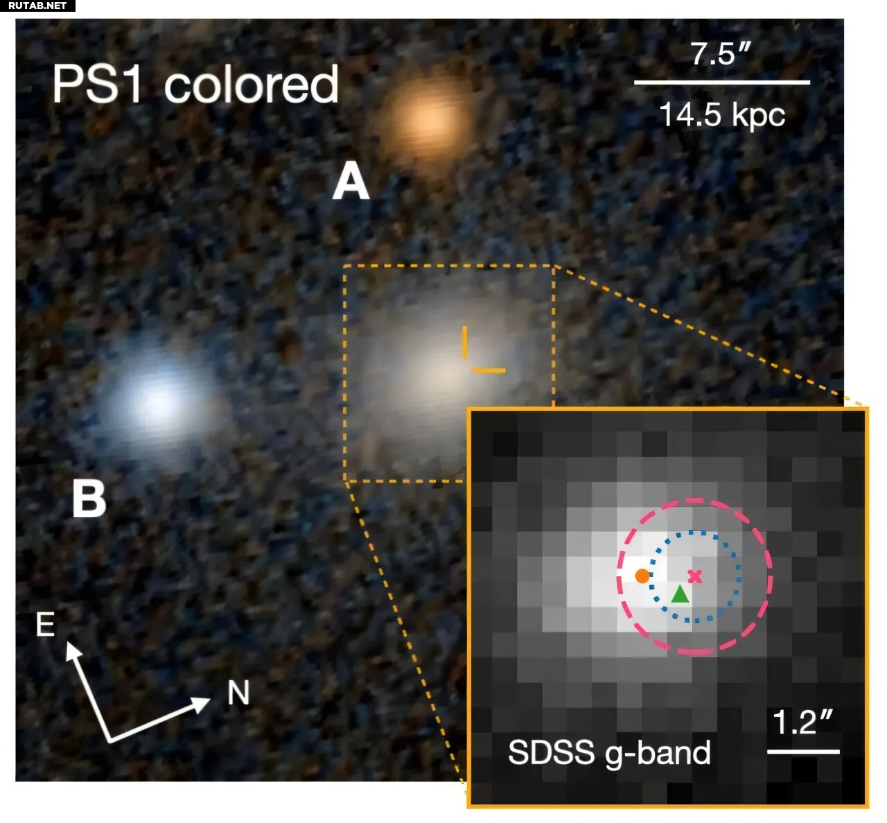 Положение транзиента в галактике-хозяине. Основная панель показывает цветное изображение галактики PS1, а врезка — изображение SDSS в g-диапазоне (оптическом диапазоне). Ближайшие объекты, обозначенные A и B, являются звёздами переднего плана. Автор: arXiv (2025). DOI: 10.48550/arxiv.2512.02136