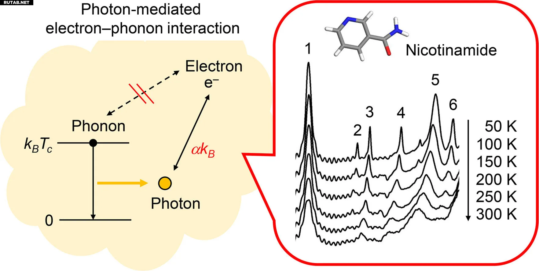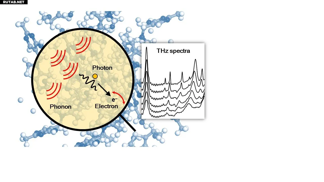 Свет (фотоны), испускаемый фононами, взаимодействует с колеблющимися электронами в кристалле, что можно наблюдать в терагерцовом спектре справа. Автор: Масаэ Такахаси