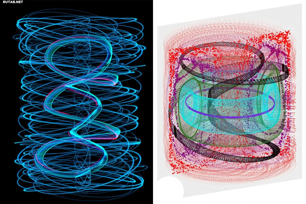 Слева: Арт-визуализация, вдохновлённая исследованием, показывающая циркуляцию жидкости во вращающемся цилиндре. Справа: Траектории движения частиц жидкости в резервуаре при наклоне крышки цилиндра, что нарушает поток. Автор: Ларри Пратт, 2013 (слева); Пратт и Рыпина (справа).