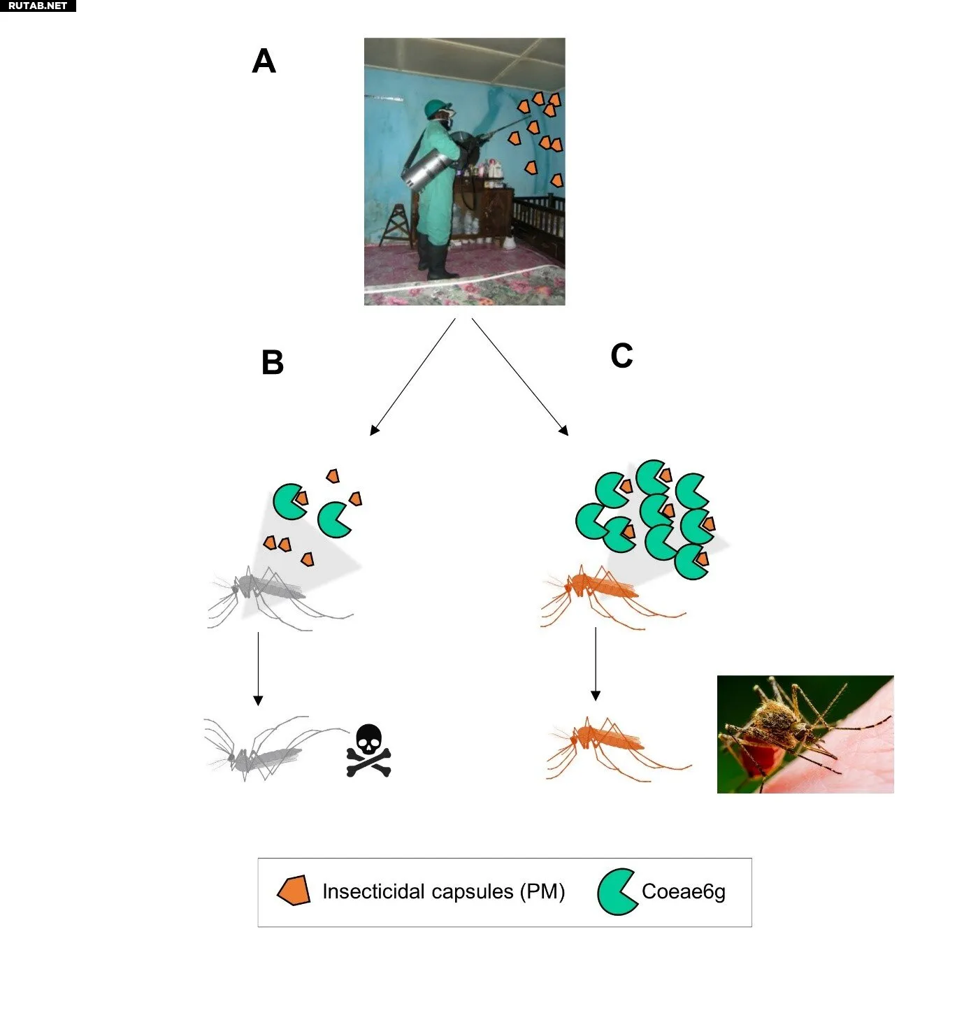 (A) Обработка стен в домах новым инсектицидом Actellic300S. (B) У восприимчивых комаров (серые) низкий уровень Coeae6g (зелёный), и они погибают от инсектицида. (C) У устойчивых комаров (оранжевые) Coeae6g сверхэкспрессируется, связывает инсектицид и нейтрализует его до того, как он подействует на нервную систему. Автор: Foundation for Research and Technology - Hellas