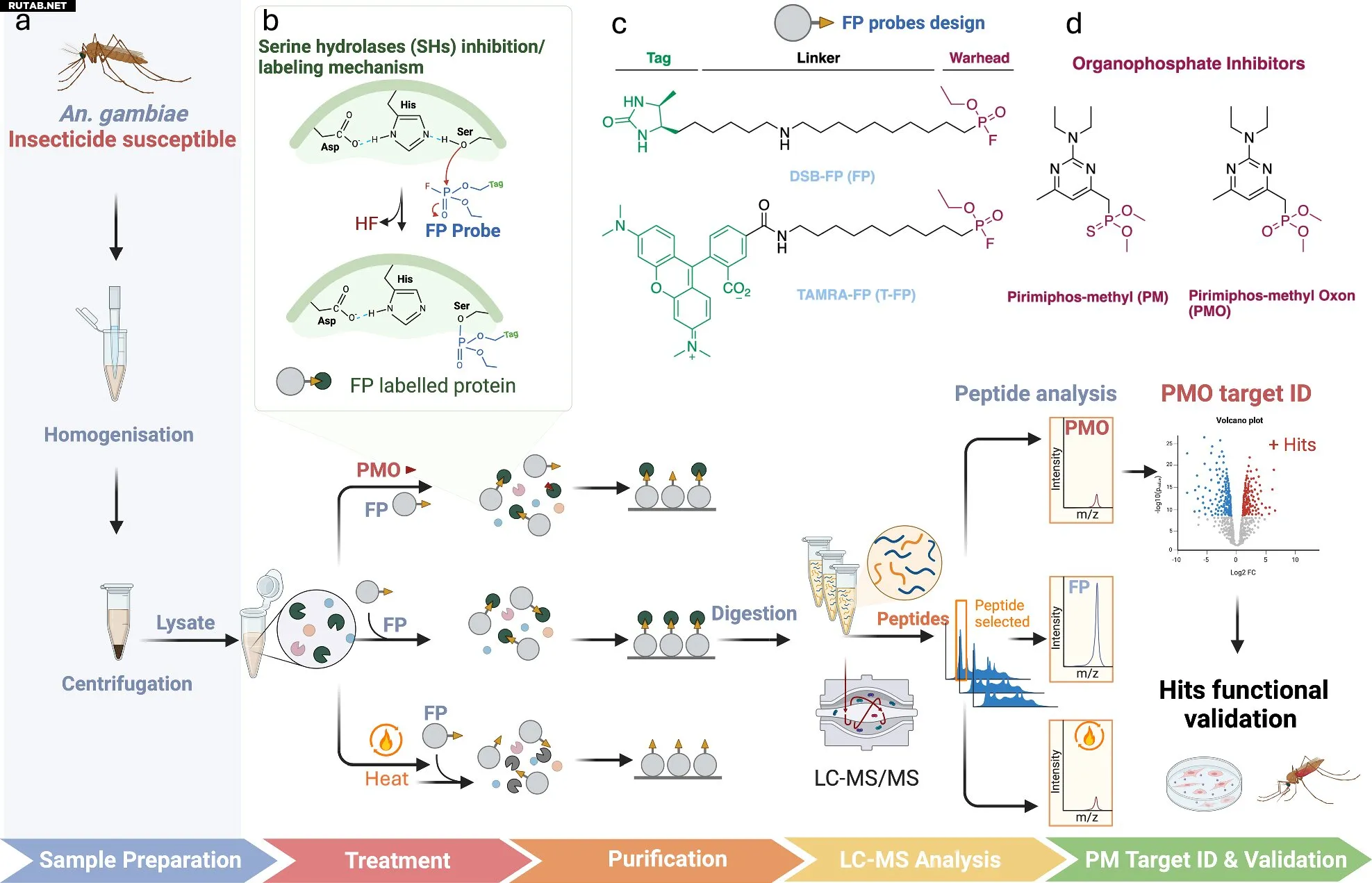 Схема химико-протеомного анализа для выявления мишеней органофосфатного инсектицида пиримифос-метила в An. gambiae. Автор: Nature Communications (2025). DOI: 10.1038/s41467-025-65827-4