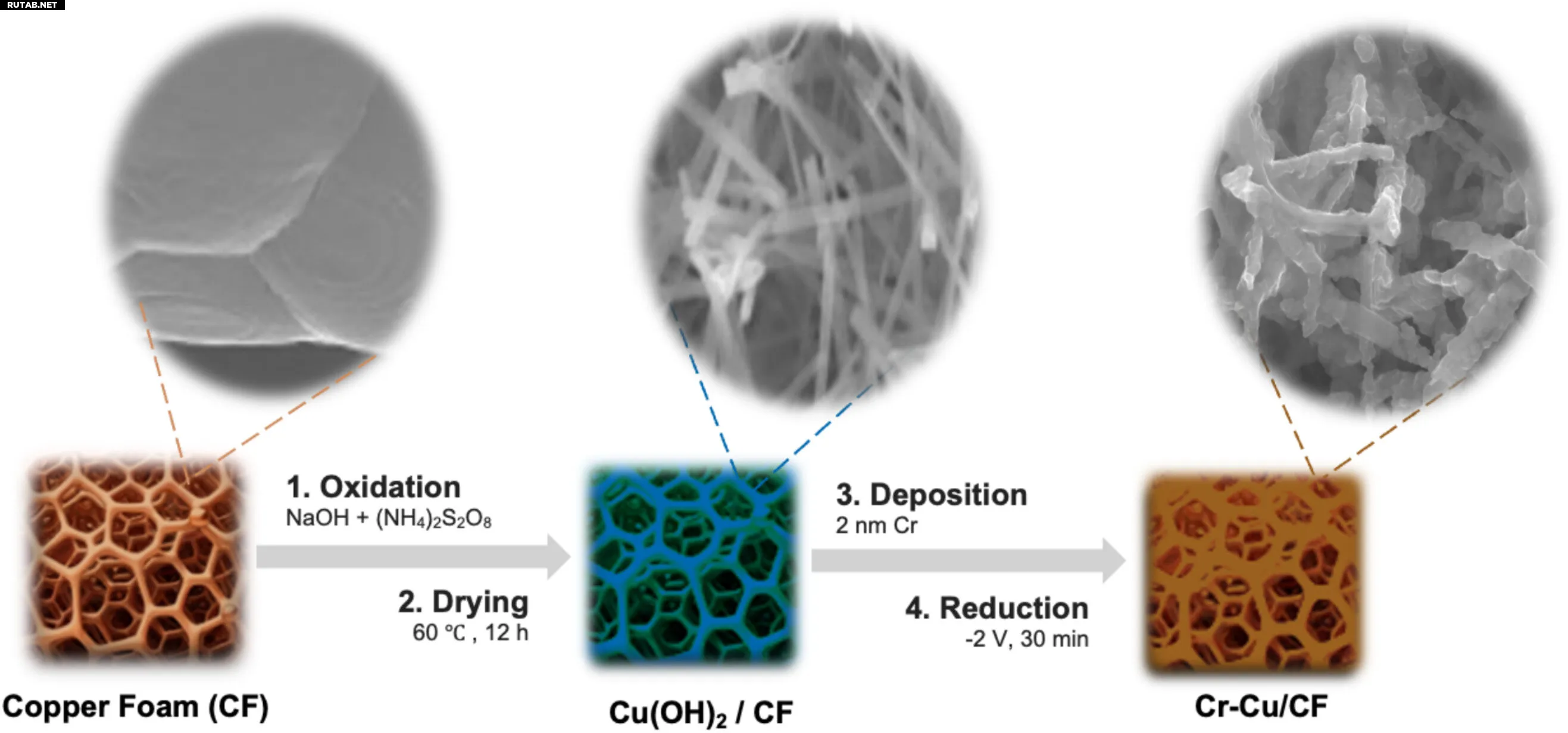 Иллюстрация синтеза катализаторов Cu/CF и Cr-Cu/CF, демонстрирующая рост микронаностержней на поверхности. Изображения в верхнем ряду получены с помощью сканирующего электронного микроскопа. Автор: Chemical Engineering Journal (2025). DOI: 10.1016/j.cej.2025.170095