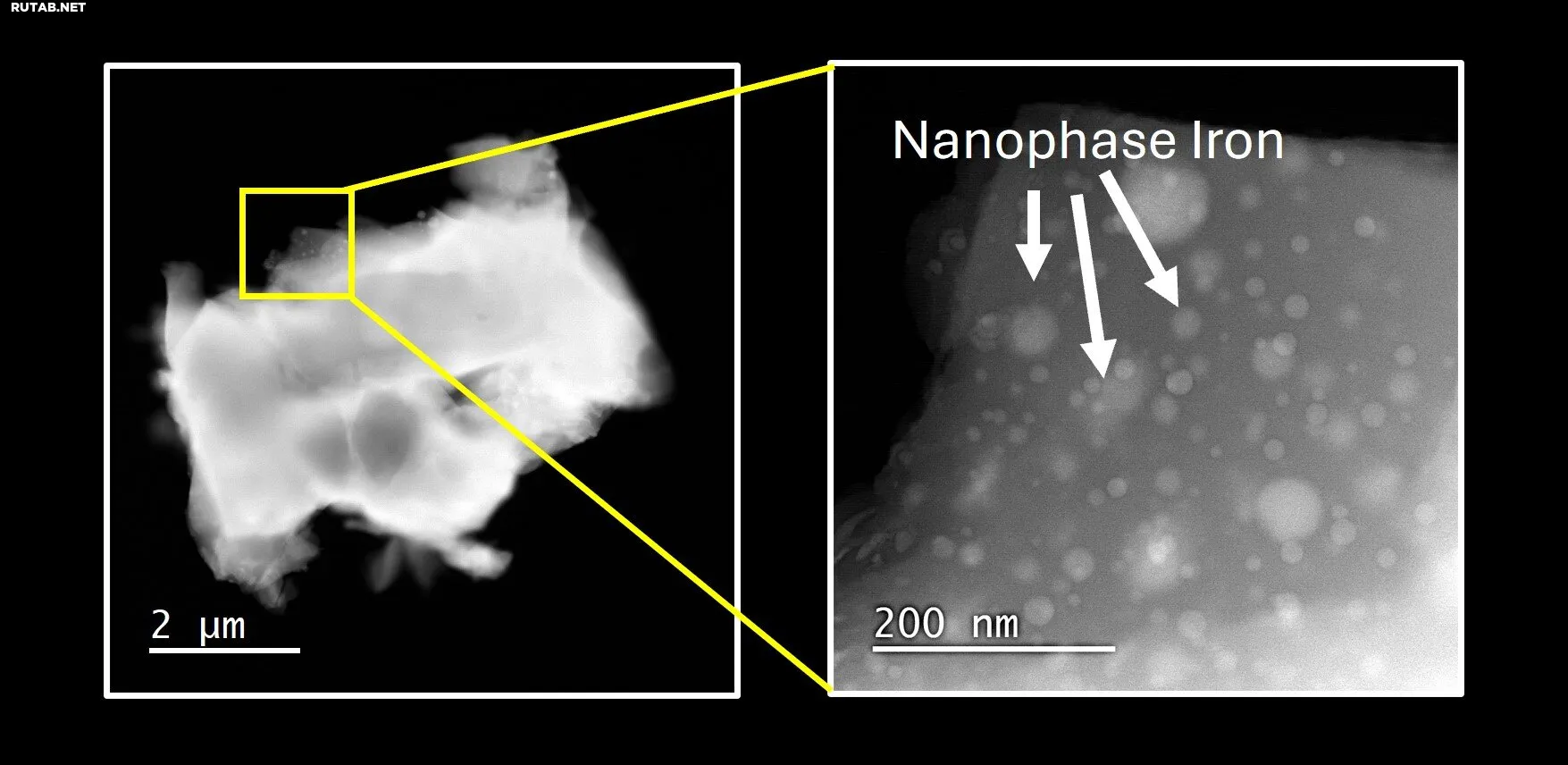 Исследование, опубликованное в Journal of Geophysical Research: Planets, показало, что выветривание, вызванное солнечным ветром и ударами микрометеоритов, увеличивает количество наночастиц железа на поверхности зёрен лунного реголита. Именно эти включения делают почву темнее в ультрафиолетовом спектре.