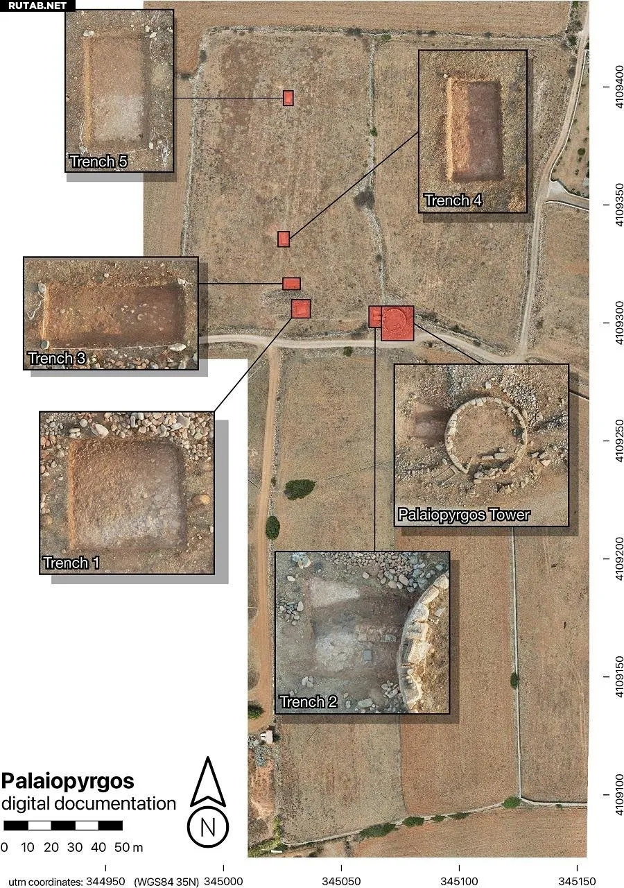 Аэрофотоснимок исследуемого района с деталями башни и раскопов. Фото: E. Dodd et al/Journal of Archaeological Science: Reports (2025)